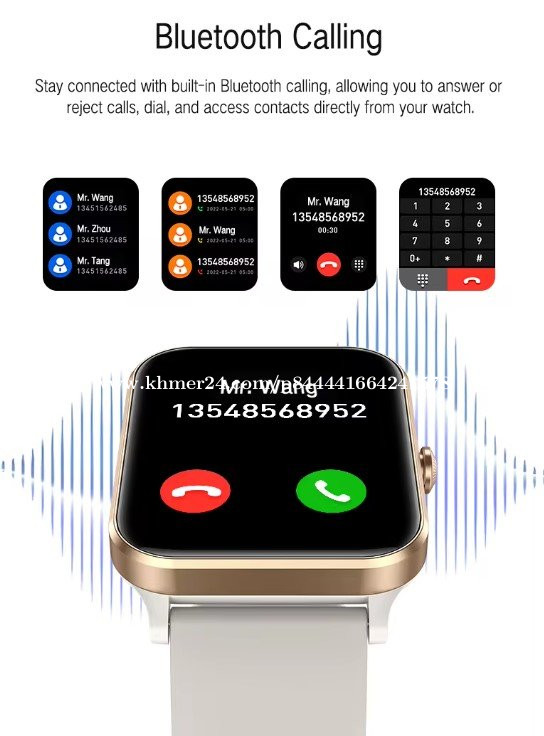 នាឡិកាឆ្លាតវៃដែលមានមុខងារតាមដានកាយសម្បទារាងកាយ និងសុខភាពចម្បង 🔷មុខងារទំនាក់ទំនង- ការហៅតាមប៊្លូធូស ការលោតសារដំណឹង AIជំនួយ កំនត់ត្រាការហៅទូរស័ព្ទ ។ល។ 🔷 មុខងារកីឡា៖ 100+ របៀបកីឡាដូចជា ដើរ រត់ ជិះកង់ បាល់បោះ បាល់ទាត់ វាយសី លោតខ្សែពួរ វាយកូនបាល់ យូហ្គា ឧបករណ៍វាស់ចម្ងាយ កាឡូរី។ល។ 🔷 ការត្រួតពិនិត្យសុខភាព៖ ការត្រួតពិនិត្យចង្វាក់បេះដូង ការត្រួតពិនិត្យសម្ពាធឈាម ការត្រួតពិនិត្យអុកស៊ីហ្សែនក្នុងឈាម ការត្រួតពិនិត្យការគេង សីតុណ្ហភាព ការរំលឹកពីការអង្គុយយូរជាដើម។ 🔷 ផ្សេងៗ៖ កម្មវិធីចាក់តន្ត្រី កម្មវិធីកំណត់ម៉ោង ស្វែងរកទូរស័ព្ទ ប្រតិទិន អេក្រង់ប៉ះពេញ ប៊ូតុងតែមួយ ប៊ូតុងបិទបើកច្រើន មុខងារកុំរំខាន។ល។ 🔷 តំលៃ $55 សម្រាប់ម៉ូដែលដែលមាន៤រូបភាពតំបូង 🔷 តំលៃ $30 សម្រាប់2ម៉ូដែលដែលមានរូបភាពចាប់ពីសន្លឹកទី៥ដល់ទី៨ ជាមួយមុខងារតិចជាងម៉ូដែលដំបូង Smart watch with primary body fitness and health monitoring functions 🔷Communications- Bluetooth calls, push messages, AI voice assistant, call records, etc. 🔷Body fitness : 100+ Sports Modes such as Walking, Running, Cycling, Basketball, Soccer, Badminton, Skipping Rope, Table Tennis, Tennis, Baseball, Yoga , pedometer, distance, calories, etc. 🔷Health monitoring: Heart rate monitoring, blood pressure monitoring, blood oxygen monitoring, sleep monitoring, Temperature, sedentary reminder, etc. 🔷Others: Music player, stopwatch, timer, find phone, calendar, full touch, single button, multi-dial switching, Do not disturb mode, etc. 🔷 Price $55 for the first model with picture 1 to 4 🔷 តំលៃ $30 for the last 2 models with less functions with pictures from 5 to 8
