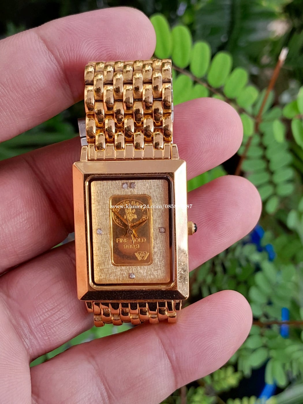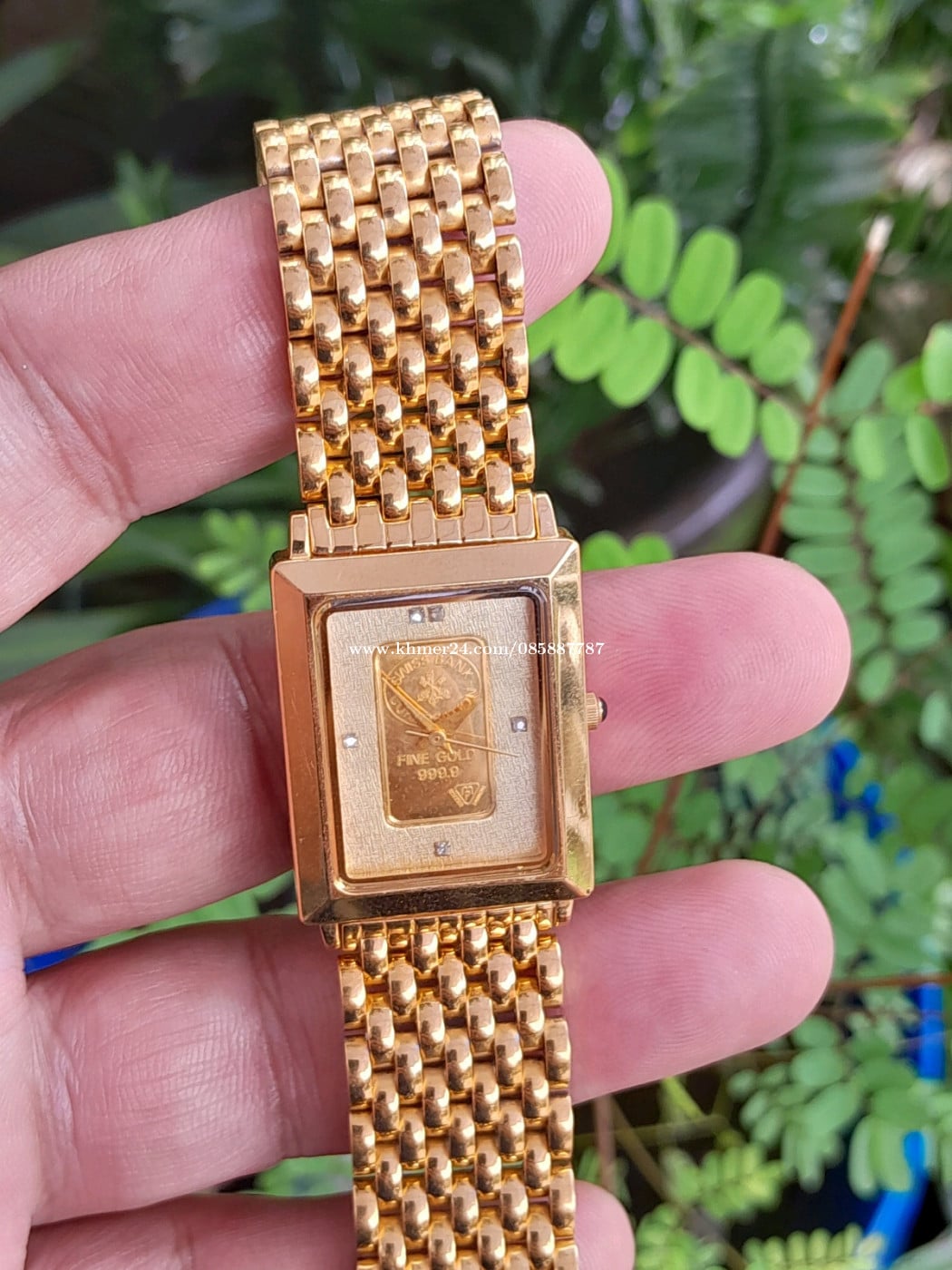 នាឡិកាដៃនារី មុខនាឡិកាមានបន្ទះមាសសុទ្ធស្វីស 24k, 1g (មាសស្វីស 999.9=1g) ម៉ាស៊ីនជប៉ុន ប្រើថ្ម តួនិងខ្សែ Stainless Steel gold plated ទំនិញមកពីជប៉ុន 085887xxxClick To Call