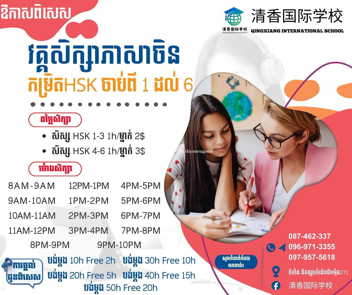 📚 ចង់និយាយភាសាចិនបានមែនទេ? មិនចាំបាច់រៀនច្រើនម៉ោងទេ រៀនតែ 1 ម៉ោងរាល់ថ្ងៃ ក៏អាចឲ្យអ្នកអភិវឌ្ឍបានដែរ! 🇨🇳 មានគ្រប់ម៉ោងអាចរើសម៉ោងបាន ✨ អ្នកទើបចាប់ផ្តើមក៏រៀនបាន ✨ មានគ្រូណែនាំផ្ទាល់ ✨ រៀនស្ដាប់ រៀនអាន និយាយបានពិតៗ ចង់ដឹងព័ត៍មានលម្អិតសូមឆាតមក Telegram: @ThyMengoan_personal