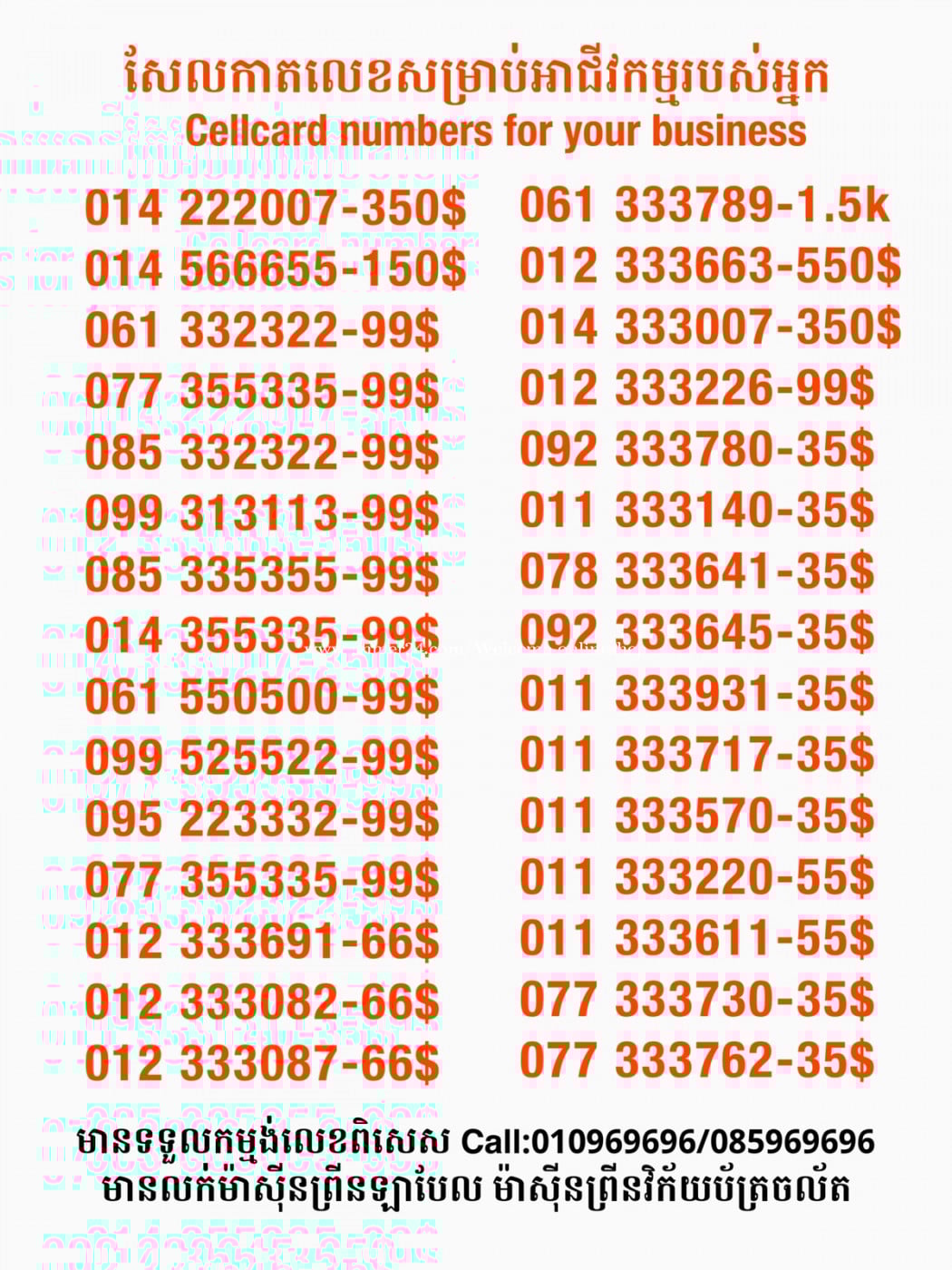 មានលក់លេខពិសេស មានទទួលកម្មង់លេខពិសេស មានលក់ម៉ាស៊ីនព្រីនឡាបែល មានលក់ម៉ាស៊ីនព្រីនវិក័យប័ត្រ មានលក់សម្ភារៈប្រើប្រាស់ក្នុងគ្រួសារ Smart Prime II 1=30$ Smart hero 1=40$ ទូរសព្ទថ្មីក្នុងប្រអប់ លក់ធូរៗរហូតអស់ពីស្តុក អាចប្រើជាឧបករណ៍សម្រាប់ស៊ែរ wifi បាន ទំនាក់ទំនង(ខ្មែរ | English | 中文):010969696 | 085969696 Telegram: https://t.me/W9696 Telegram group: https://t.me/konkonnada អាសយដ្ឋាន:ផ្ទះលេខ២៣ ផ្លូវបេតុងលេខ១ ភូមិទួលពង្រ សង្កាត់ចោមចៅ ខណ្ឌពោធិ៍សែនជ័យ រាជធានីភ្នំពេញ ទីតាំង https://goo.gl/maps/8moqW4iTHUfJEvWQ9 ដើម្បីស្វែងរកលេខអាជីវកម្មដែលលោកអ្នកពេញចិត្ត សូមចូលទៅកាន់:https://www.khmer24.com/Welcome-onlineshop