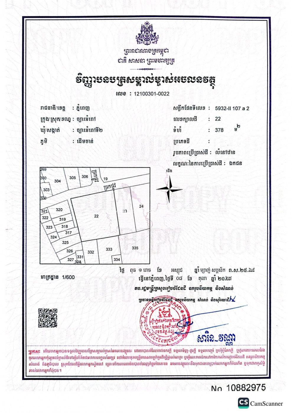 ដី និងបន្ទប់ជួលលក់ ៖ - ទីតាំងនេះ ស្ថិតនៅខាងជើង ស្ពានព្រះមុនីវង្ស ផ្លូវ៣៦៩ (ផ្លូវច្រាំងបាក់) ដល់ចំណុចមុខផ្សារបន្លែច្បារអំពៅ២ បត់ឆ្វេងចូលផ្លូវលំមាត់ទន្លេ ចូលចំងាយប្រមាណ 100ម៉ែត្រ នឹងដល់ទីតាំងដី ស្ថិតនៅឆ្វេងដៃ - បច្ចុប្បន្ននេះ ទីតាំងនេះ មានបន្ទប់ជួល3ខ្នង ស្មើ21បន្ទប់ (ក្បាលដី 19.5ម x 21ម) ដែលមានចំណូលប្រចាំខែស្រាប់ចំនួន 1,000$ - ប្លង់រឹង : 378 ម៉ែត្រក្រឡា ( ប្រព័ន្ធ )