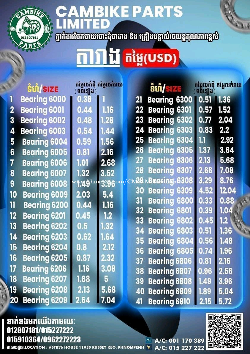 ✅សួស្ដីអតិថិជនជាទីគោរព❤️ 🙏សូមស្វាគមន៍មកាន់បាដាងដែលមានគុណភាពខ្ពស់របស់យើងខ្ងុំ! 🛠ផលិតដោយវិធីសាស្ត្រជឿនលឿន ⚙បាដាងដែលមានគុណភាពខ្ពស់របស់យើងមានលក្ខណៈដូចខាងក្រោម៖ 💯💯💯សម្ភារៈមានគុណភាពខ្ពស់: 🦾ដែកឆ្មាំឬដែកអ៊ីណុកដែលមានគ្រាប់បាល់យ៉ាងរឺងមុាំ។ 🫦ការ រចនាប្រើបច្ចេកវិទ្យាឈានមុខគេ: ⚙ប្លុកគ្រាប់បាល់ជ្រៅសម្រាប់ការការពារទង្គិចយ៉ាងល្អប្រសើរ។ 🛠មានការលាបជាមុន: 👉ត្រៀមសម្រាប់ការប្រើប្រាស់ជាមួយសារធាតុរអិល 👉មានជ័រការពារធូលីនិងទឹក 👉ផលិតដោយបច្ចេកវិទ្យាទំនើប CNC ដែលធ្វើឱ្យផលិតផលរបស់យើងធន់បានយូរបំផុតនៅលើទីផ្សារ 👉អាចប្រើបានលើយានយន្ត គ្រឿងចក្រ និងម៉ាស៊ីនគ្រប់ប្រភេទ។ 👊ផលិតផលរបស់យើងគឺមានតម្លៃល្អបំផុតនៅលើទីផ្សារសម្រាប់គុណភាព។✅✅✅ 🚗🏍⚙ ទទួលបានភាពជឿជាក់និងប្រសិទ្ធភាពដ៏ល្អឥតខ្ចោះ។ ជ្រើសរើសបាដាងដែលមានគុណភាពខ្ពស់របស់យើងសម្រាប់ការអនុវត្តប្រសិទ្ធភាពនិងភាពជឿជាក់ក្នុងការប្រើប្រាស់។🥰 💲ថ្លៃទំនិញ និងសេវាកម្មដឹកជញ្ជូន: 📌ប្រភេទទំនិញ លក់រាយ: ✅ទំហំ 60xx តម្លៃ 1គ្រាប់ $1.25 ✅ទំហំ 61xx តម្លៃ 1 គ្រាប់ $1.75 ✅ទំហំ 62xx តម្លៃ 1 គ្រាប់ $2.25 ✅ ........................................ 📍ប្រភេទទំនិញលក់ដុំ ✅ទំហំ 60xx តម្លៃ 1គ្រាប់ $0.49 x 50pcs = $24.50 ✅ទំហំ 61xx តម្លៃ 1 គ្រាប់ $0.79x 50pcs = $ 39.50 ✅ទំហំ 62xx តម្លៃ 1 គ្រាប់ $1.25 x 50pcs = $62.50 ✅ ............................................ 1/ តាមខេត្ត៖ តាមវិកយបត្រជាក់ស្តែង 2/ ភ្នំពេញ៖ មិនគិតថ្លៃសេវា (ចាប់ពី 50គ្រាប់) 🧰 សូមអញ្ជើញមកពិនិត្យមើលទំនិញផ្ទាល់ ឬផ្ញើរទៅទីតាំងរបស់លោកអ្នកដើម្បីសាកល្បងគុណភាពមុនទិញក៏បាន។ 👉ឈុតសម្រាប់ :🏍 ម៉ូតូ 🛻ឡាន🛴 ម៉ូតូអាគុយ🛠 គ្រឿងម៉ាស៊ីន ⚙ម៉ាស៊ីនចំហេះខាងក្នុង 🚈🩼ស្នប់ 🎞គ្រឿងសំណង់ 🚜អេស្កាវ៉ាទ័រ🛺 ឧស្សាហកម្ម។ល។ 🤝 ក្រុមហ៊ុនយើងខ្ញុំកំពុងស្វែងរកភ្នាក់ងារ និងអ្នកលក់ដុំ នៅក្នុង ខេត្ត 25 ទូទាំងប្រទេសកម្ពុជា ដើម្បីចែកចាយបាដាងដែលមានគុណភាពខ្ពស់របស់យើង។ ✅ ចំណូលចិត្តសម្រាប់អ្នកលក់ដុំ ឬហាងលក់គ្រឿងម៉ាស៊ីន និងយានយន្ត ✅ ការគាំទ្រពីក្រុមហ៊ុនដោយផ្ទាល់ និងផ្ដល់តម្លៃពិសេសសម្រាប់ដៃគូ 📞 សម្រាប់ព័ត៌មានបន្ថែម សូមទំនាក់ទំនង: 📱សូមទំនាក់ទំនង Tel: 012807xxxClick To Call, 015227xxxClick To Call, 015910xxxClick To Call,0962272xxxClick To Call😃😃 PUSCO TECHNOLOGY CO., LIMITED 🌎 អ៊ីមែល៖ kos******@gmail.comClick To Sent Email 🌎FB: https://www.facebook.com/profile.php?id=61563937470882&mibextid=ZbWKwL @ Telegram: @Cambike_Parts @ WhatsApp: 012807xxxClick To Call (Cambike Parts)