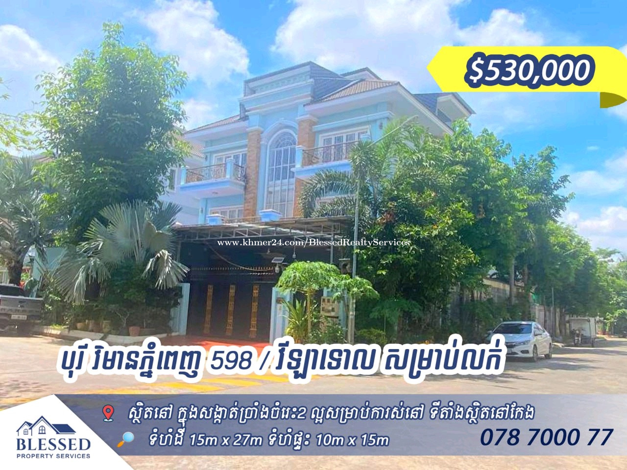 បុរី វិមានភ្នំពេញ 598💥 វីឡាទោល សម្រាប់លក់ តម្លៃ ៖ $530,000 ✨ ទំហំដី ៖ 15m x 27m ✨ ទំហំផ្ទះ ៖ 10m x 15m ✨ បន្ទប់គេង៖ 6 ✨ បន្ទប់ទឹក៖ 7 ✨ កម្ពស់ ៖ 3ជាន់ ✨ ប្លង់រឹង( 411sqm) 📍 ទីតាំងស្ថិតនៅ សង្កាត់ច្រាំងចំរេះ2 ងាយស្រួលក្នុងការស់នៅ ងាយស្រួលធ្វើដំណើរ ជិតសាលារៀន មន្ទីពេទ្យ ផ្សារទំនើប សូមទំនាក់ទំនង 078700xxxClick To Call https://t.me/ryansear