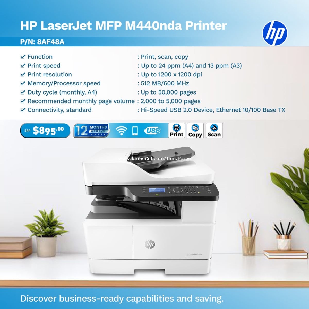 បើនិយាយពីរឿងព្រីន ស្កេន ឬកូពីទុកចិត្តលើ HP LaserJet MFP M440nda! មិនត្រឹមតែលឿនទេ តែថែមទាំងផ្ដល់នូវគុណភាពកម្រិតខ្ពស់ថែមទៀតផង៖ ✅ បោះពុម្ពលឿន 24សន្លឹកក្នុងមួយនាទី ✅ បំពាក់ដោយ RAM 512MB ធ្វើការងារធំៗបានយ៉ាងងាយ ✅ មុខងារ 3-in-1 (Print, Scan, Copy) ក្នុងម៉ាស៊ីនតែមួយ 📱 Phone: +855714600xxxClick To Call 📨 Telegram: https://t.me/linkforgetechnology 🌐 Website: www.linkforgetechnology.com 📧 Email: inf*@linkforgetechnology.comClick To Sent Email 💬 Facebook Page Inbox: LinkForge Technology 🛒 Delivery available nationwide 📍 Address: Phnom Penh, Cambodia