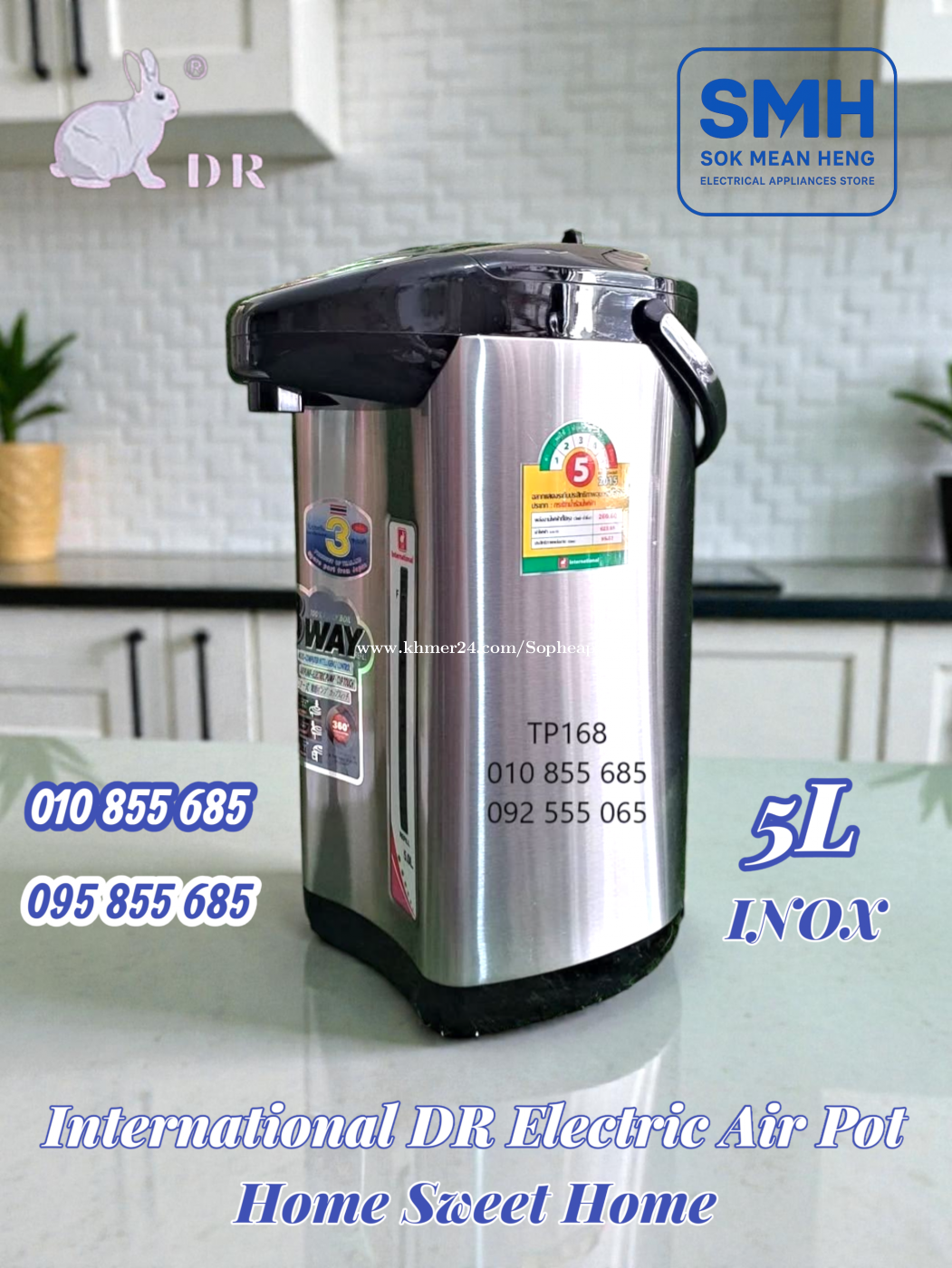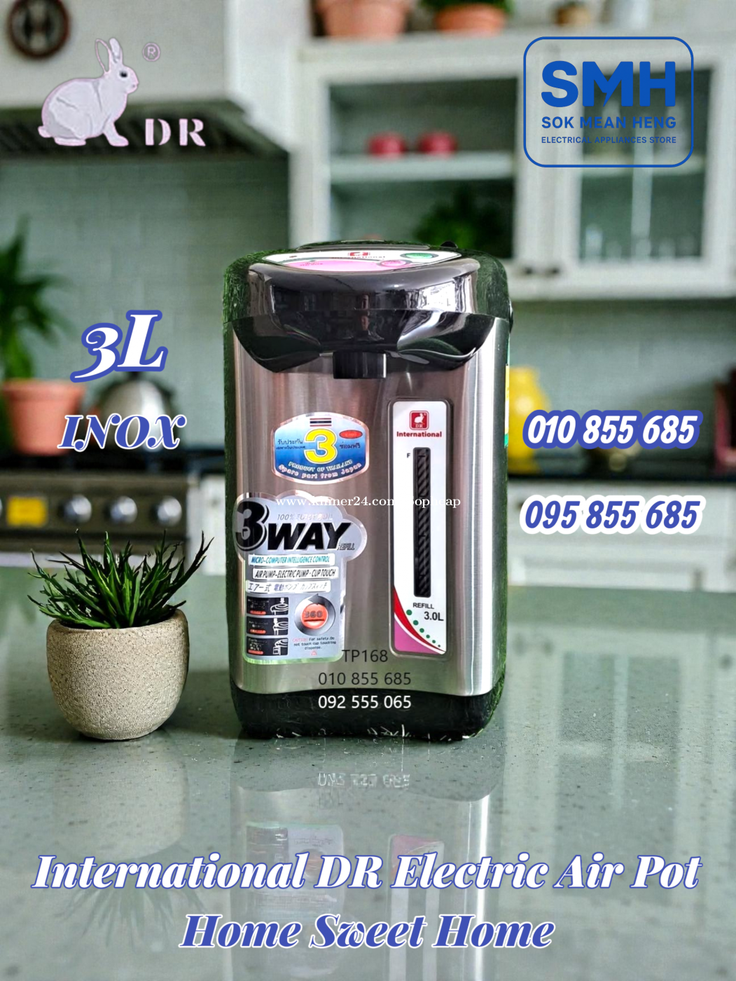 បំពង់ទឹកក្តៅអគ្គីសនី_អ៊ីណុក InternationalDR Electric Air Pot - INOX _ 3L / 3.5L / 5L (NEW) . - Materials: អ៊ីណុក / Inox - ដាំទឹកពុះ 100% / Fully Boil Function (100% Fully Boil) - 3 Ways Dispenser: Air Pump / Electric Pump / Cup Touch - បង្វិលបាន 360° / 360° Coreless Basic . 1. បំពង់ទឹកក្តៅអគ្គីសនី_អ៊ីណុក Inter DR-300 Electric Air Pot _ 3L _ Inox - Capacity: 3លីត្រ / 3Litres - Power: 730W - 220V ~ 50Hz * តំលៃ / Price: 25.9$ . 2. បំពង់ទឹកក្តៅអគ្គីសនី_អ៊ីណុក Inter DR-350 Electric Air Pot _ 3.5L _ Inox - Capacity: 3.5លីត្រ / 3.5Litres - Power: 730W - 220V ~ 50Hz * តំលៃ / Price: 26.9$ . 3. បំពង់ទឹកក្តៅអគ្គីសនី_អ៊ីណុក Inter DR-500 Electric Air Pot _ 5L _ Inox - Capacity: 5លីត្រ / 5Litres - Power: 730W - 220V ~ 50Hz * តំលៃ / Price: 31.9$ . SMH / សុខ មាន ហេង / Sok Mean Heng ហាងលក់គ្រឿងប្រើប្រាស់អគ្គិសនី / Electrical Appliances Store . Phone Number / Telegram (សេវាកម្មរហ័ស / Fast Service): Smart: 010855xxxClick To Call _ http://t.me/SokMeanHeng168 Cellcard: 095855xxxClick To Call _ http://t.me/Annsopheap095 . អាស័យដ្ឋាន / Address: No. 392, MaoTseToung Blvd. (St. 245), Phnom Penh. (Near P Jolie Beauty Center) . ផែនទី / Maps: https://www.google.com/maps?q=11.55595844757693,104.90165490657091&15 . #បំពង់ទឹកក្តៅអគ្គីសនី #ElectricAirPot #AirPot #JarPot #ThermoPot #WaterDispenser