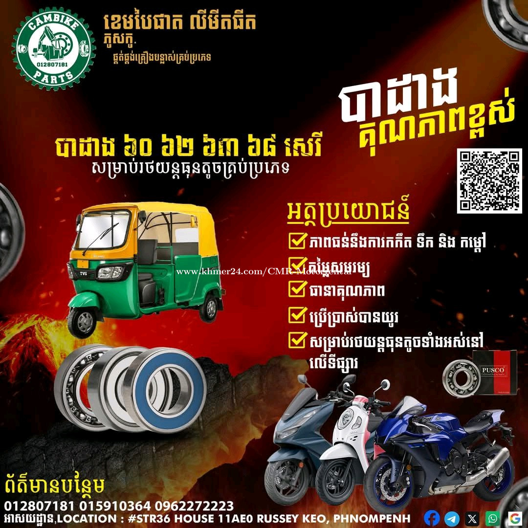 ❤️អតិថិជនជាទីគោរព!😊 សូមស្វាគមន៍មកកាន់💋 Cambike Parts ប្រសិនបើអ្នកទាំងអស់គ្នាចាប់អារម្មណ៍ទិញដុំ ឬរាយ ចំពោះប៉ាដាងម៉តូដែលមានសម្លេងស្ងាត់ រឹងម៉ាំ មិនសឹក( Low Noise Motorcycle Bearing Deep Groove Ball Bearing)ម៉ាក៖ PUSCO ⚙️ ល្បឿនលឿន ⚙️ ប្រើប្រាស់យឺនយូរ ⚙️ រឹងធន់ 📌ប្រភេទទំនិញ លក់រាយ: ✅ទំហំ 6201 តម្លៃ 1គ្រាប់ $1.25 ✅ទំហំ 6203 តម្លៃ 1 គ្រាប់ $1.75 ✅ទំហំ 6304 តម្លៃ 1 គ្រាប់ $2.25 💲ថ្លៃដឹកជញ្ជូន៖ 1/ តាមខេត្ត៖ តាមវិកយបត្រជាក់ស្តែង 2/ ភ្នំពេញ៖ មិនគិតថ្លៃសេវា 🧰 សូមអញ្ជើញមកពិនិត្យមើលទំនិញផ្ទាល់ ឬផ្ញើរទៅទីតាំងរបស់លោកអ្នកដើម្បីសាកល្បងគុណភាពមុនទិញបាន។ 👉ឈុតសម្រាប់ :🏍 ម៉ូតូ 🛻ឡាន🛴 ម៉ូតូ🛠 គ្រឿងម៉ាស៊ីន ⚙ម៉ាស៊ីនចំហេះខាងក្នុង 🚈🩼ស្នប់ 🎞គ្រឿងសំណង់ 🚜អេស្កាវ៉ាទ័រ🛺 ឧស្សាហកម្ម។ល។ 📱សូមទំនាក់ទំនង Tel: 012807xxxClick To Call, 015227xxxClick To Call, 015910xxxClick To Call,0962272xxxClick To Call😃😃 PUSCO TECHNOLOGY CO., LIMITED @ អ៊ីមែល៖ kos******@gmail.comClick To Sent Email @ Google Map: Cambike Auto Parts (PUSCO) https://goo.gl/maps/dNDm1VKYoUyMZ5uNA @ FB: https://www.facebook.com/profile.php?id=61563937470882&mibextid=ZbWKwL @ Telegram: @Cambike_Parts @ WhatsApp: 012807xxxClick To Call (Cambike Parts)