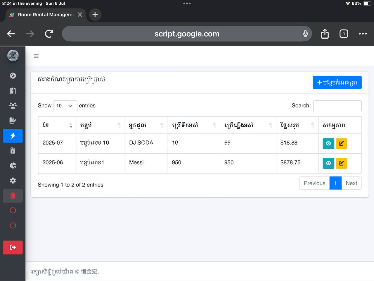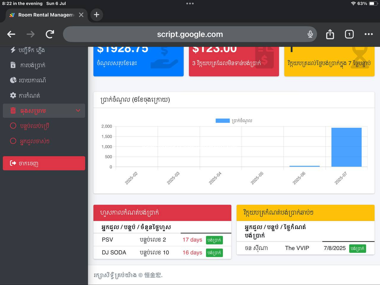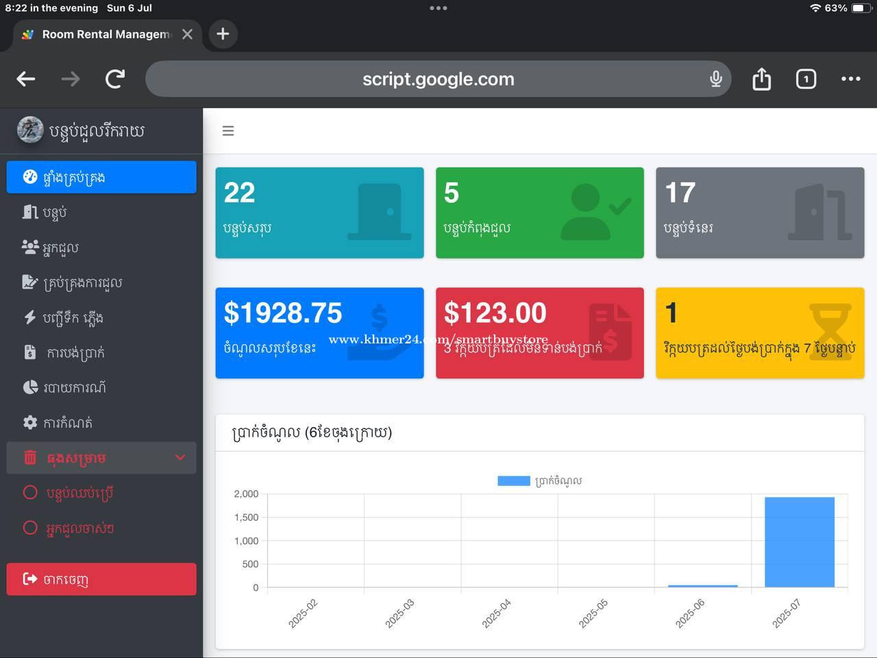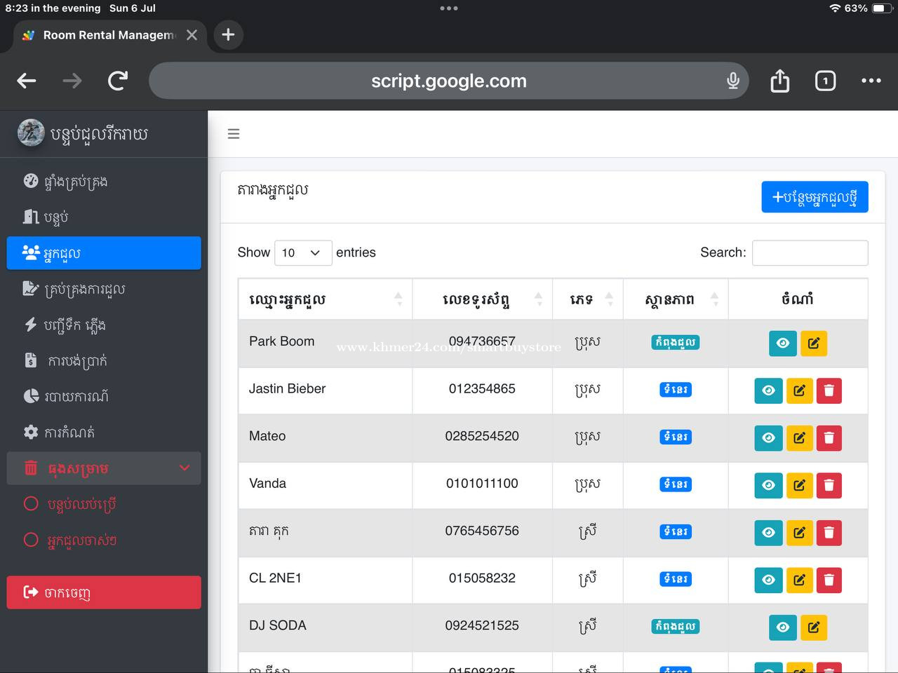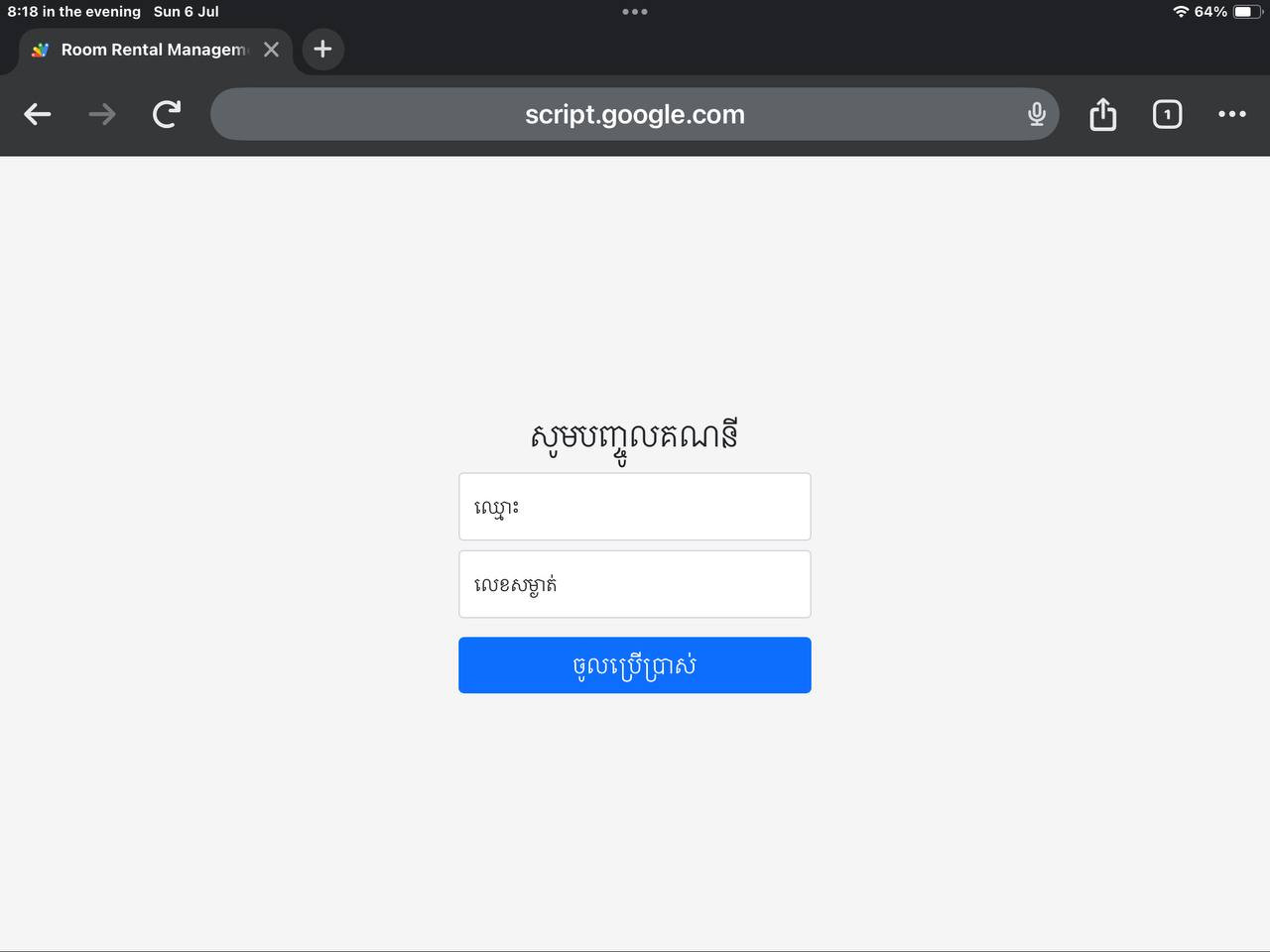 ប្រព័ន្ធគ្រប់គ្រងបន្ទប់ជួល 15$ ប្រើរហូត អាចចូលប្រើប្រាស់សាកបាន https://script.google.com/macros/s/AKfycbyemdf9qaVoCnZCiI6iQjlxbt0sAAz1FmuNSHcHKnLZy0i3jnyuCJwzbNNgUCtMBPfx/exec username : user password : 654321