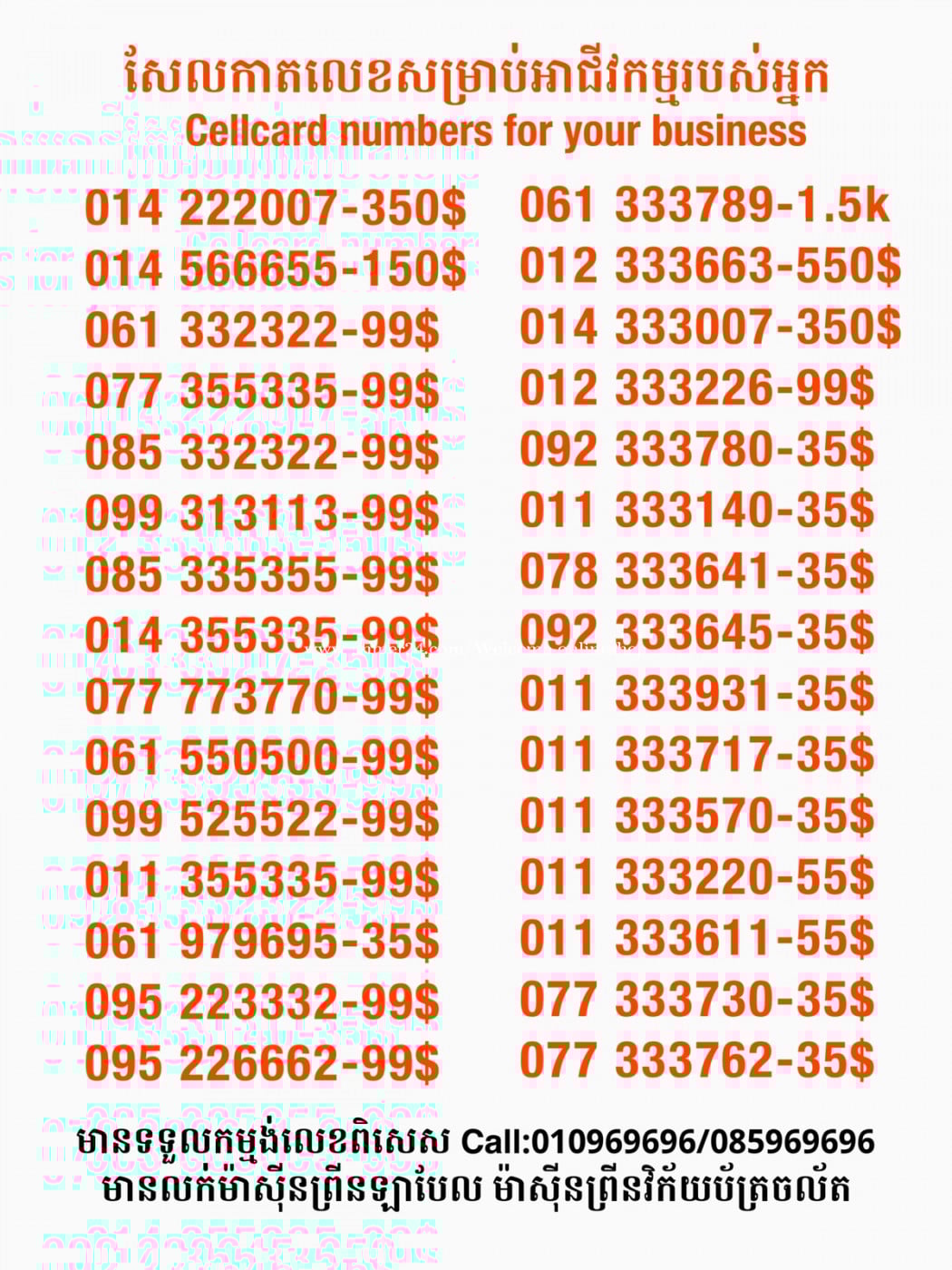 មានលក់លេខពិសេស មានទទួលកម្មង់លេខពិសេស មានលក់ម៉ាស៊ីនព្រីនឡាបែល មានលក់ម៉ាស៊ីនព្រីនវិក័យប័ត្រ មានលក់សម្ភារៈប្រើប្រាស់ក្នុងគ្រួសារ Smart Prime II 1=30$ Smart hero 1=40$ ទូរសព្ទថ្មីក្នុងប្រអប់ លក់ធូរៗរហូតអស់ពីស្តុក អាចប្រើជាឧបករណ៍សម្រាប់ស៊ែរ wifi បាន ទំនាក់ទំនង(ខ្មែរ | English | 中文):010969696 | 085969696 Telegram: https://t.me/W9696 Telegram group: https://t.me/konkonnada អាសយដ្ឋាន:ផ្ទះលេខ២៣ ផ្លូវបេតុងលេខ១ ភូមិទួលពង្រ សង្កាត់ចោមចៅ ខណ្ឌពោធិ៍សែនជ័យ រាជធានីភ្នំពេញ ទីតាំង https://goo.gl/maps/8moqW4iTHUfJEvWQ9 ដើម្បីស្វែងរកលេខអាជីវកម្មដែលលោកអ្នកពេញចិត្ត សូមចូលទៅកាន់:https://www.khmer24.com/Welcome-onlineshop