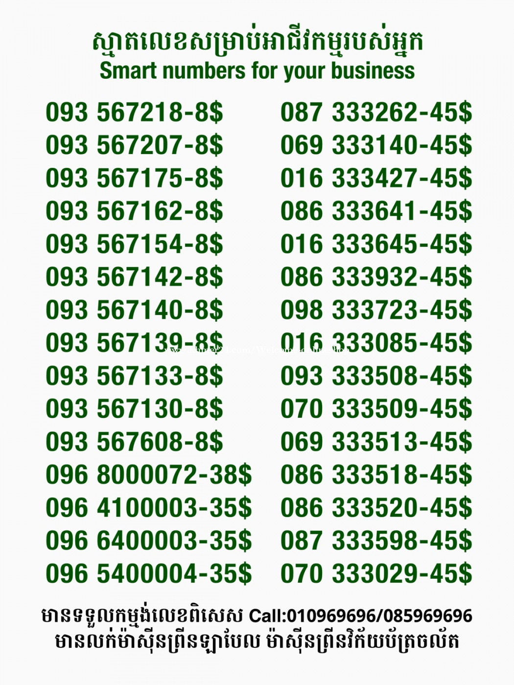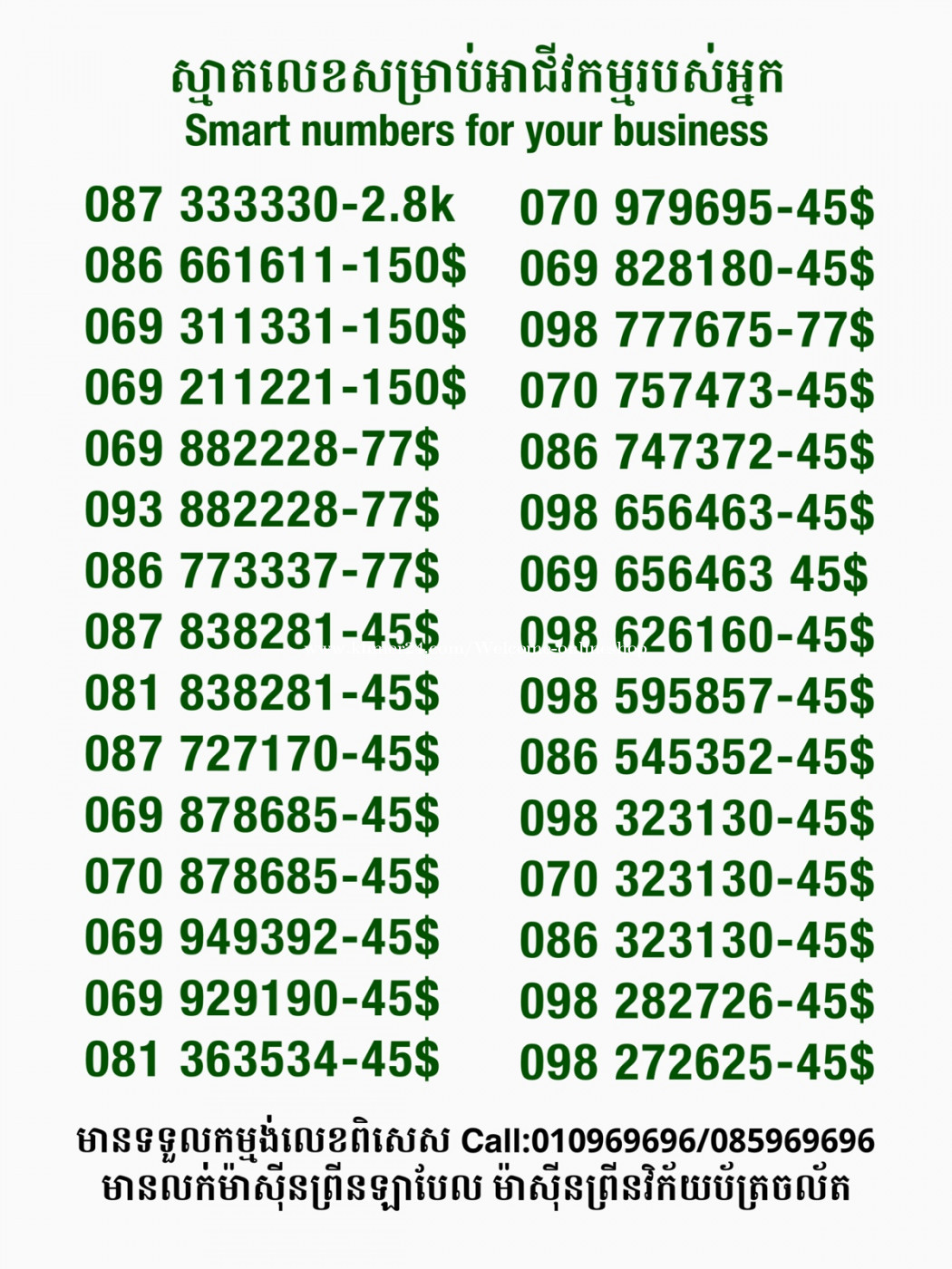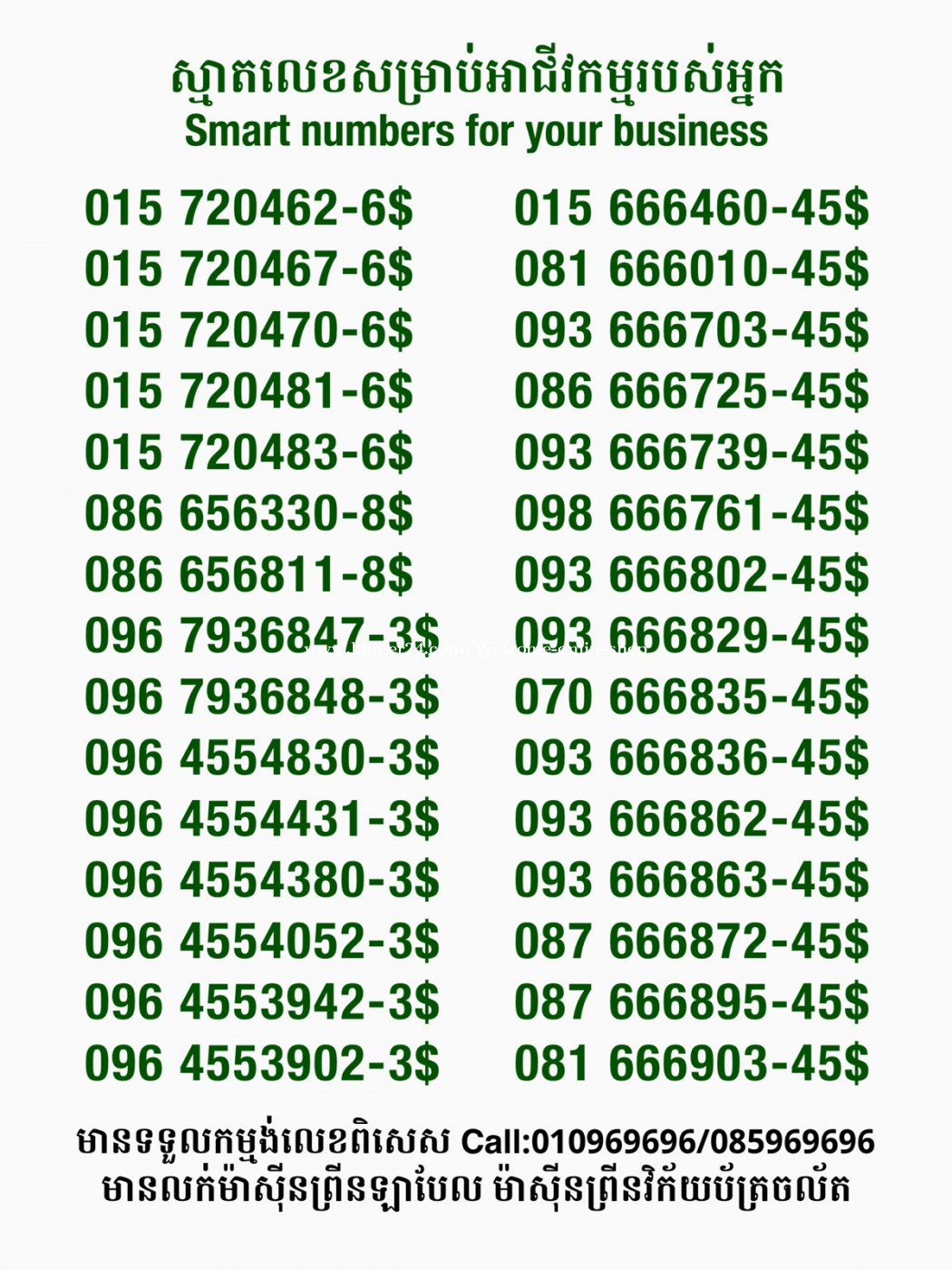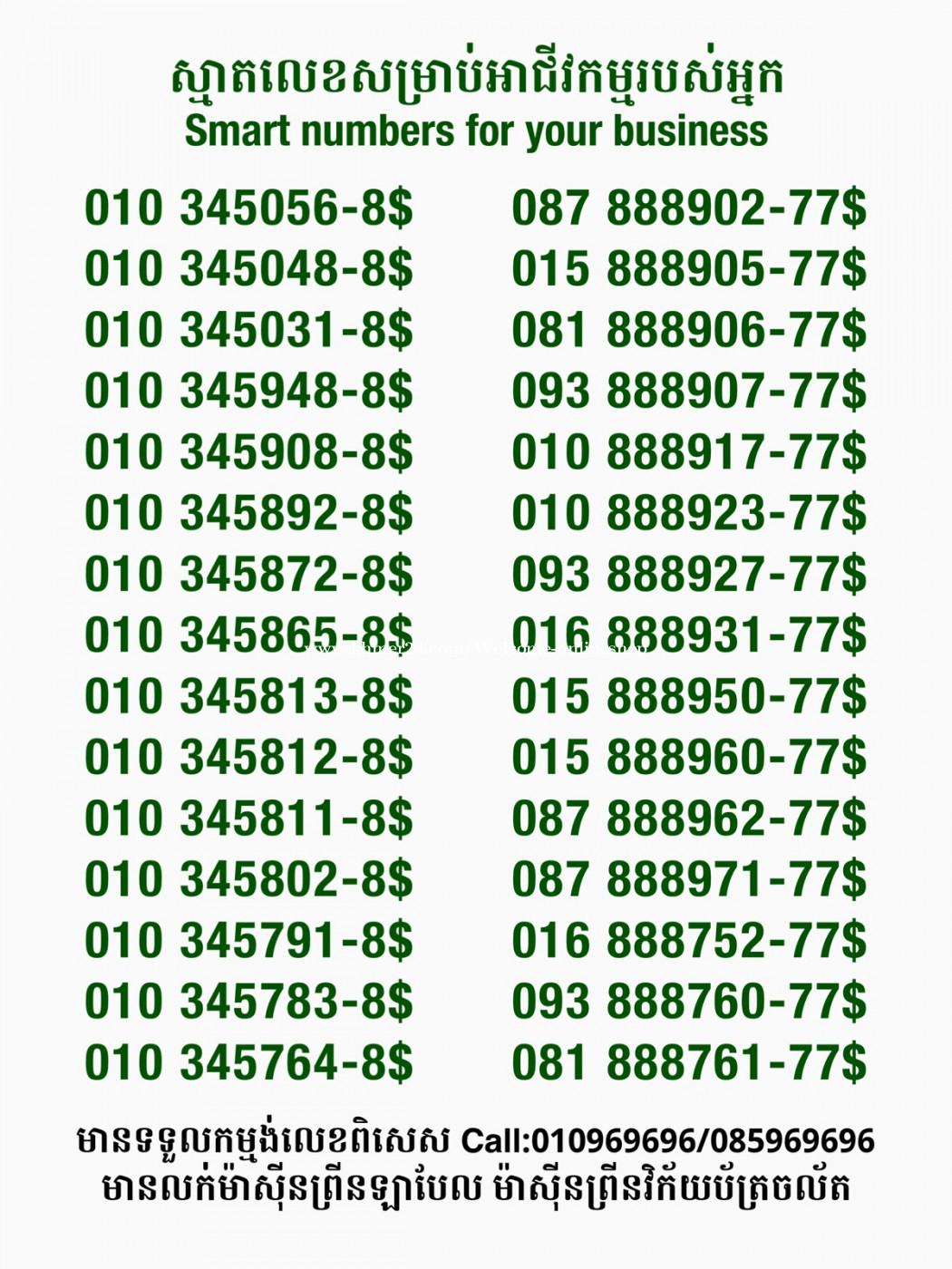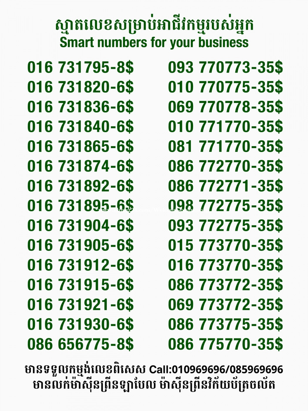 មានលក់លេខពិសេស មានទទួលកម្មង់លេខពិសេស មានលក់ម៉ាស៊ីនព្រីនឡាបែល មានលក់ម៉ាស៊ីនព្រីនវិក័យប័ត្រ មានលក់សម្ភារៈប្រើប្រាស់ក្នុងគ្រួសារ Smart Prime II 1=30$ Smart hero 1=40$ ទូរសព្ទថ្មីក្នុងប្រអប់ លក់ធូរៗរហូតអស់ពីស្តុក អាចប្រើជាឧបករណ៍សម្រាប់ស៊ែរ wifi បាន ទំនាក់ទំនង(ខ្មែរ | English | 中文):010969696 | 085969696 Telegram: https://t.me/W9696 Telegram group: https://t.me/konkonnada អាសយដ្ឋាន:ផ្ទះលេខ២៣ ផ្លូវបេតុងលេខ១ ភូមិទួលពង្រ សង្កាត់ចោមចៅ ខណ្ឌពោធិ៍សែនជ័យ រាជធានីភ្នំពេញ ទីតាំង https://goo.gl/maps/8moqW4iTHUfJEvWQ9 ដើម្បីស្វែងរកលេខអាជីវកម្មដែលលោកអ្នកពេញចិត្ត សូមចូលទៅកាន់:https://www.khmer24.com/Welcome-onlineshop