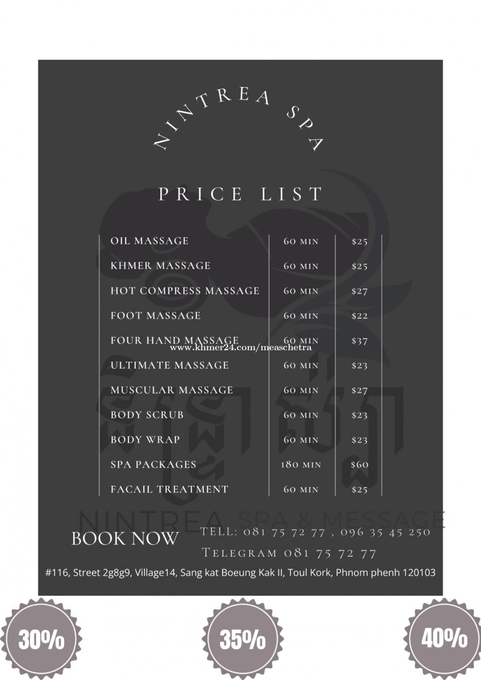 👉 ប្រម៉ូសិនក្នុងឱកាសបុណ្យភ្ជុំបិណ្ឌខាងមុខនេះហាង និន្រ្ទា ស្ប៉ា យើងខ្ញុំនិងមានការបញ្ចុះតម្លៃ 30% ដល់ 40%សំរាប់កាម៉ាស្សាទាំងអស់ 🎉☺️ - គ្រប់តែធ្វើការកក់ទុកមុន និងបានការបញ្ចុះតម្លៃ 30% ដល់40% ភ្លាមៗគ្រប់សេវាកម្មម៉ាស្សា🎉☺️ ☎️Book us via - Telegram https://t.me/nintreaspa - WhatsApp 081757xxxClick To Call 📞 081757xxxClick To Call / 0963545xxxClick To Call 📍 https://maps.app.goo.gl/hiey6HYxK1hBjMih7?g_st=ipc