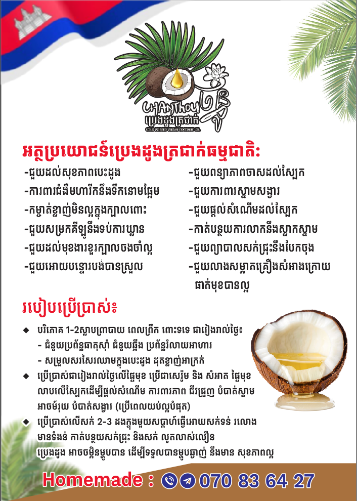 #ចន្ធូប្រេងដូងធម្មជាតិ អត្ថប្រយោជន៍ប្រេងដូងត្រជាក់ធម្មជាតិ: -ជួយដល់សុខភាពបេះដូង -ការពារជំងឺមហារីកនឹងទឹកនោមផ្អែម -កម្ចាត់ខ្លាញ់មិនល្អក្នុងក្បាលពោះ -ជួយសម្រកគីឡូនឹងទប់ការឃ្លាន -ជួយដល់មុខងារខួរក្បាលចងចាំល្អ -ជួយអោយបន្ទោរបង់បានស្រួល -ជួយពន្យាភាពចាសដល់ស្បែក -ជួយការពារស្នាមសង្វារ -ជួយផ្តល់សំណើមដល់ស្បែក -កាត់បន្ថយការលាកនឹងស្លាកស្នាម -ជួយព្យាបាលសក់ជ្រុះនឹងបែកចុង -ជួយលាងសម្អាតគ្រឿងសំអាងក្រោយផាត់មុខបានល្អ 📲070836xxxClick To Call Telegram បោះដុំលក់រាយ ពត័មានលំអិតឆាតតាមតេលេក្រាម🙏❤️
