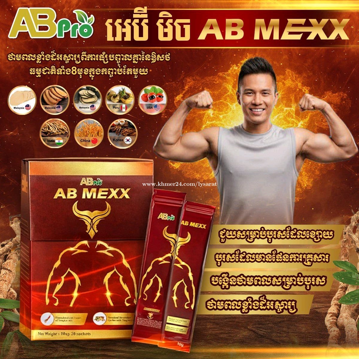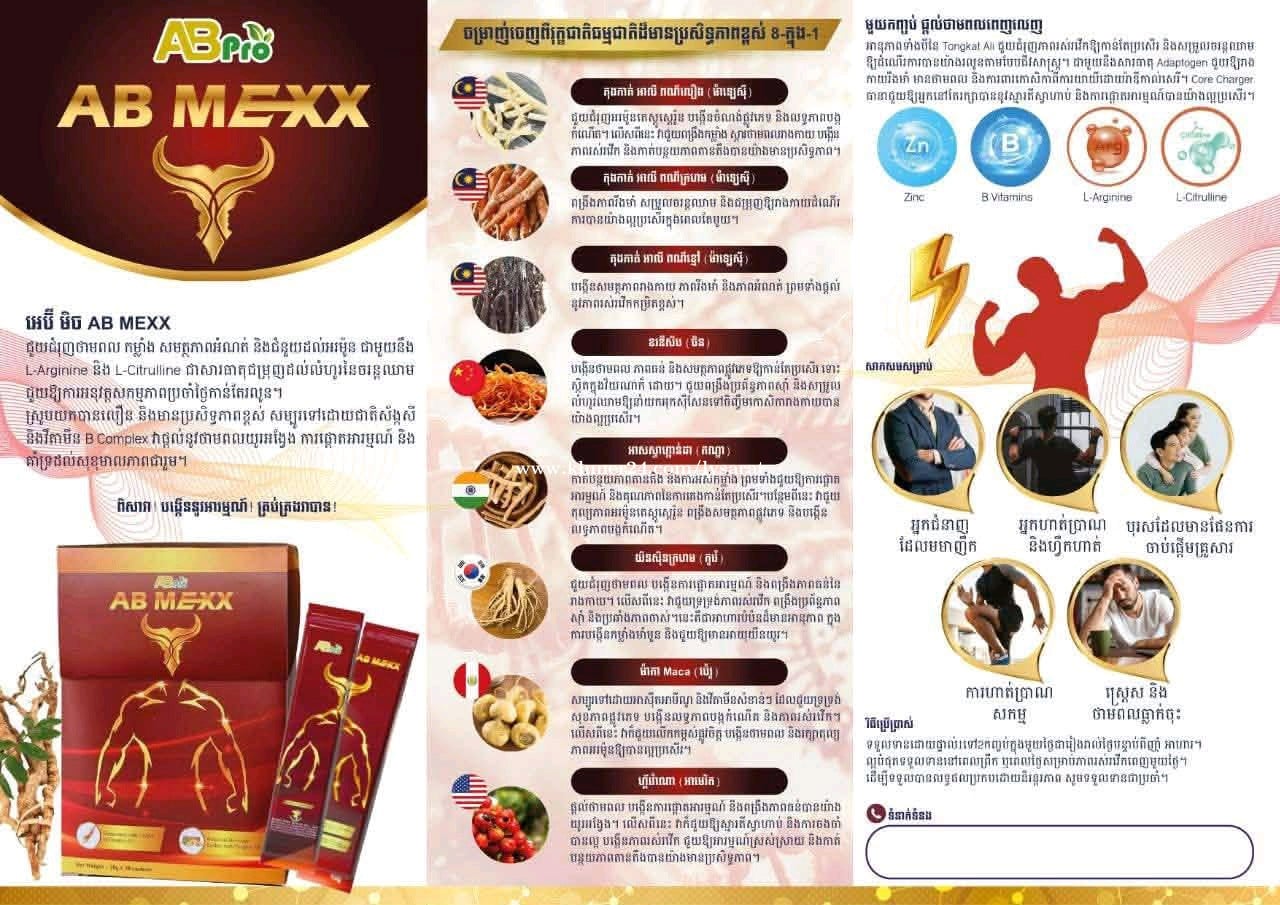 អេប៊ី មិច AB MEXX សំរាប់បុរស មានធាតុផ្សំពិសេសៗ8មុខ មកពី6ប្រដូចជា: 1.តុងកាត់ អាលី ពណ៌លឿង,ក្រហម,ខ្មៅ មកពីប្រទេស ម៉ាឡេស៊ី 2.ខរឌីសិប : មកពីប្រទេសចិន 3.អាសស្វាហ្គាន់ដា មកពីប្រទេសឥណ្ឌា 4.យិនសុិន ក្រហម មកពីប្រទេស កូរ៉េ 5.ម៉ាកា មកពីប្រទេស ប៉េរូ 6.ហ្គ័ររ៉ាណា មកពីប្រទេស អាមេរិក ដោយសារតែ រុក្ខជាតិសំខាន់ៗអស់នេះហើយ ទើបធ្វើឱ្យបុរសៗខ្លាំង💪រឹងមាំ ស្វាហាប់ រស់រវើក បានយូរ ប្រយុទ្ធបានច្រើនដង💪💪 1ប្រអប់មាន30កញ្ចប់តូច សាកល្បងអស់តែ1កញ្ចប់ ធានាថាខ្លាំង100% ➡️សំរាប់ព័ត៌មានបន្ថែមសូមទាក់ទងមក: ☎️070394xxxClick To Call (ស្មាតហ្វូន) 068394xxxClick To Call (មិត្តហ្វូន097) តេឡេក្រាម: https://t.me/Saratly168