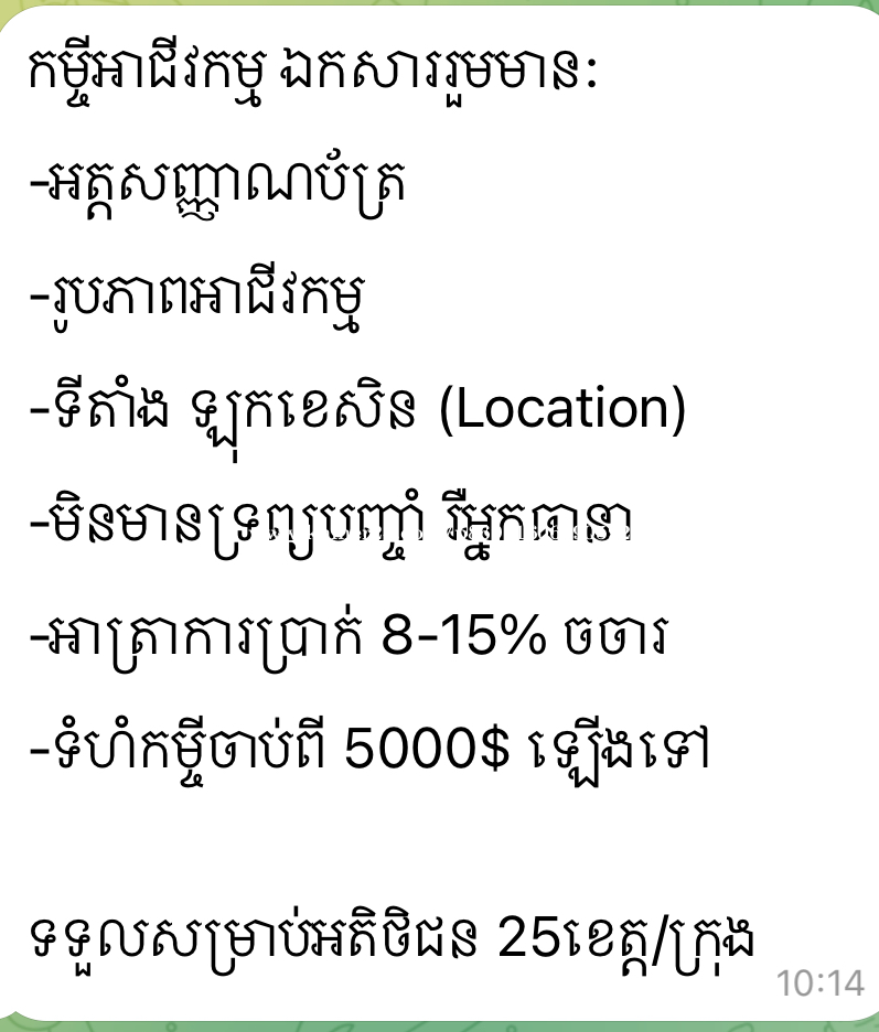 កម្ចីអាជីវកម្ម ឯកសាររួមមាន: -អត្តសញ្ញាណប័ត្រ -រូបភាពអាជីវកម្ម -ទីតាំង ឡុកខេសិន (Location) -មិនមានទ្រព្យបញ្ចាំ រឺអ្នកធានា -អាត្រាការប្រាក់ 8-15% ចចារ -ទំហំកម្ចីចាប់ពី 5000$ ឡើងទៅ ទទួលសម្រាប់អតិថិជន 25ខេត្ត/ក្រុង កម្ចីបញ្ចាំប្លង់រឹង ឯកសាររួមមាន: -អត្តសញ្ញាណប័ត្រ -សៀវភៅគ្រួសារ រឺសៀវភៅស្នាក់នៅ -ប្លង់រឹង និងរូភាពដី -ទីតាំងដី google map -អាត្រាការប្រាក់ចន្លោះ 2%-5% កាត់ទឹក 5% -ទំហំកម្ចីចាប់ពី 30000$ ឡើងទៅ ទទួលសម្រាប់អតិថិជន -ភ្នំពេញ កម្ចីបញ្ចាំកាតគ្រី ឯកសាររួមមាន: -អត្តសញ្ញាណប័ត្រ -កាតគ្រីស៊ីន (តម្កល់) -រូបភាពម៉ូតូ ថតចំស្លាកលេខ -អាត្រាការប្រាក់ 8-15% ចចារ -ទំហំកម្ចីចាប់ពី 50-60% ទទួលសម្រាប់អតិថិជន -ភ្នំពេញ កណ្ដាល កំពង់ស្ពឺ កំពត ទំនាក់ទនងលេខ: 016918xxxClick To Call/012322xxxClick To Call