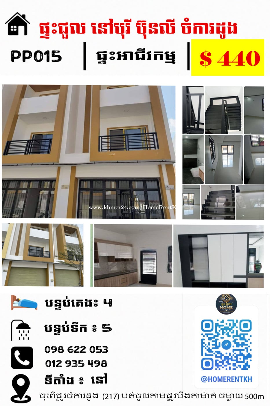 ផ្ទះជួល នៅបុរីប៊ុនលី ចំការដូង រស់នៅបែបស៊ីវិល័យ សុវត្ថិភាព ផាសុខភាព 🏡 ព័ត៌មានទូទៅ 🛏️ Bedroom: 4 🛁 Bathroom: 5 🌅 Facing: East 🏠 Type: Flat House 💵 តម្លៃជួល: $440/ខែ (ផ្ទះចុង) (អាចចរចាបាន) 💰 លក់/ចរចា: (អាចបន្ថែមបាន បើមានតម្លៃលក់) 📐 ទំហំដី 4.2m × 20.5m និង 5.7m × 20.5m (ផ្ទះចុង) 🏠 ទំហំផ្ទះ 4.2m × 14m 🌿 ផ្ទះចុង មានដីបន្ថែម សល់ដីមុខ: 4.5m សល់ដីក្រោយ: 2m ដីចំហៀង: 1.5m ✨ លក្ខណៈពិសេស បន្ទប់គេង 4 បន្ទប់ទឹក 5 ផ្ទះបែរទៅទិសខាងកើត សមរបសម្រាប់ការរស់នៅបែបសុវត្ថិភាព និងផាសុខភាព ជិតគម្រោងធំៗ ផ្សារ & ខុនដូ 📍 ទីតាំង ចុះពីផ្លូវចំការដូង (217) បត់ចូលតាមផ្លូវបឹងតាម៉ាត់ ប្រហែល 500m (ទីតាំងល្អក្នុងបុរី Bunly, ខណ្ឌ Dangkor) 📞 Tel: 098622xxxClick To Call / 012935xxxClick To Call 📲 Telegram: t.me/homerentkh 🏡 មើលផ្ទះជាច្រើនទៀត: t.me/HomeRentService 🆔 Code: PP016 #HouseForRent #HouseForSale #BoreyBunly #DangkorDistrict #PhnomPenhHouseRent