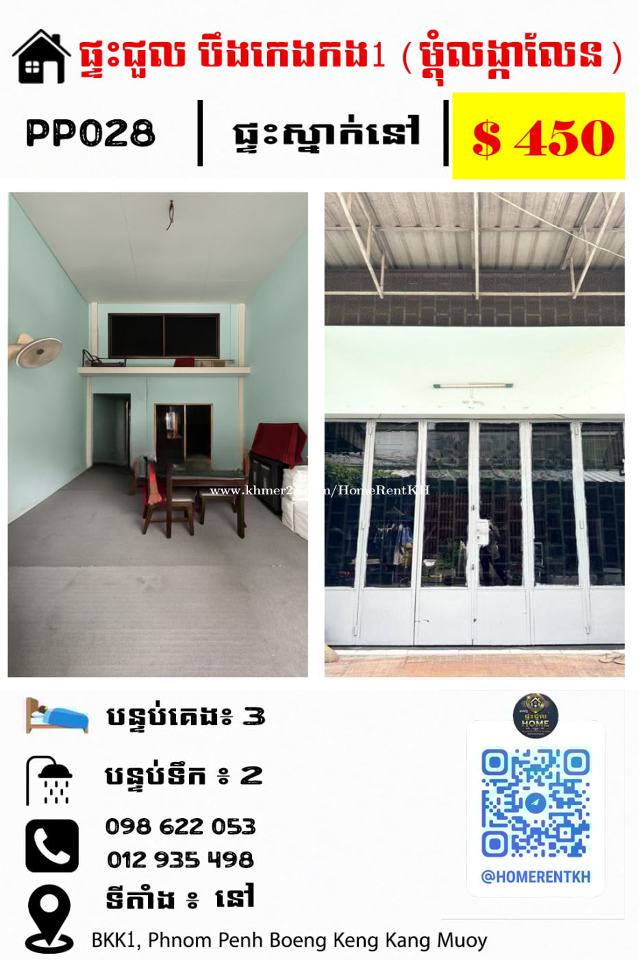 ផ្ទះជួល នៅ បឹងកេងកង 1 (BKK1 – ម្តុំលង្កាលែន) 🏡 ព័ត៌មានទូទៅ 🛏️ Bedroom: 3 🛁 Bathroom: 2 🌅 Facing: South 💵 តម្លៃជួល៖ $450/ខែ ✨ លក្ខណៈពិសេស • នៅតំបន់ ទីប្រជុំជន BKK1 • សាកសមសម្រាប់៖ ការរស់នៅ ការិយាល័យតូចៗ ហាងតូចៗ / សេវាកម្មតូចៗ • តំបន់សុវត្ថិភាព មានភាពងាយស្រួលក្នុងការធ្វើដំណើរ 📍 ទីតាំង BKK1, Phnom Penh Beong Keng Kang Muoy, Khan Boeng Keng Kang, Phnom Penh 📞 ទំនាក់ទំនង Tel: 098622xxxClick To Call / 012935xxxClick To Call 📲 Telegram: 👉 https://t.me/HomeRentKH 🏡 មើលផ្ទះជាច្រើនទៀត: https://t.me/HomeRentService 🆔 Code: PP028 #HouseForRent #BKK1 #BoengKengKang #PhnomPenhRental #HomeRentService #PhnomPenhRealEstate