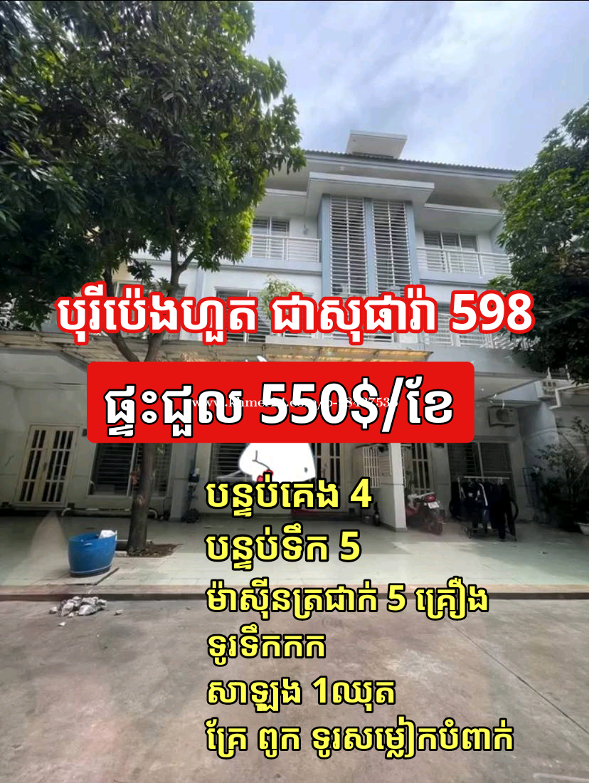 🏠ផ្ទះជួល(ប៉េងហួត598) 📍ទីតាំង នៅបុរីប៉េងហួត ជាសុផារ៉ា 598 💸តម្លៃ 550$/ខែ ✅បន្ទប់គេង 4 ✅បន្ទប់ទឹក 5 ✅ម៉ាសុីនត្រជាក់ 5 គ្រឿង ✅ទូរទឹកកក ✅សាឡុង 1ឈុត ✅គ្រែ ពូក ទូរសម្លៀកបំពាក់ ✅ផ្ទះបែរទៅទិសខាង កើត ✅ទឹកភ្លើងរដ្ឋ 📝កុងត្រា1ឆ្នាំ កក់2 បង់1 Code:D.Y0042 ☎️ទំនាក់ទំនង៖ 📱092858xxxClick To Call (Cellcard) 📱086442xxxClick To Call (Smart) 📩 Telegram https://t.me/VB8886 https://t.me/VB2272 🙏សូមអរគុណ🙏