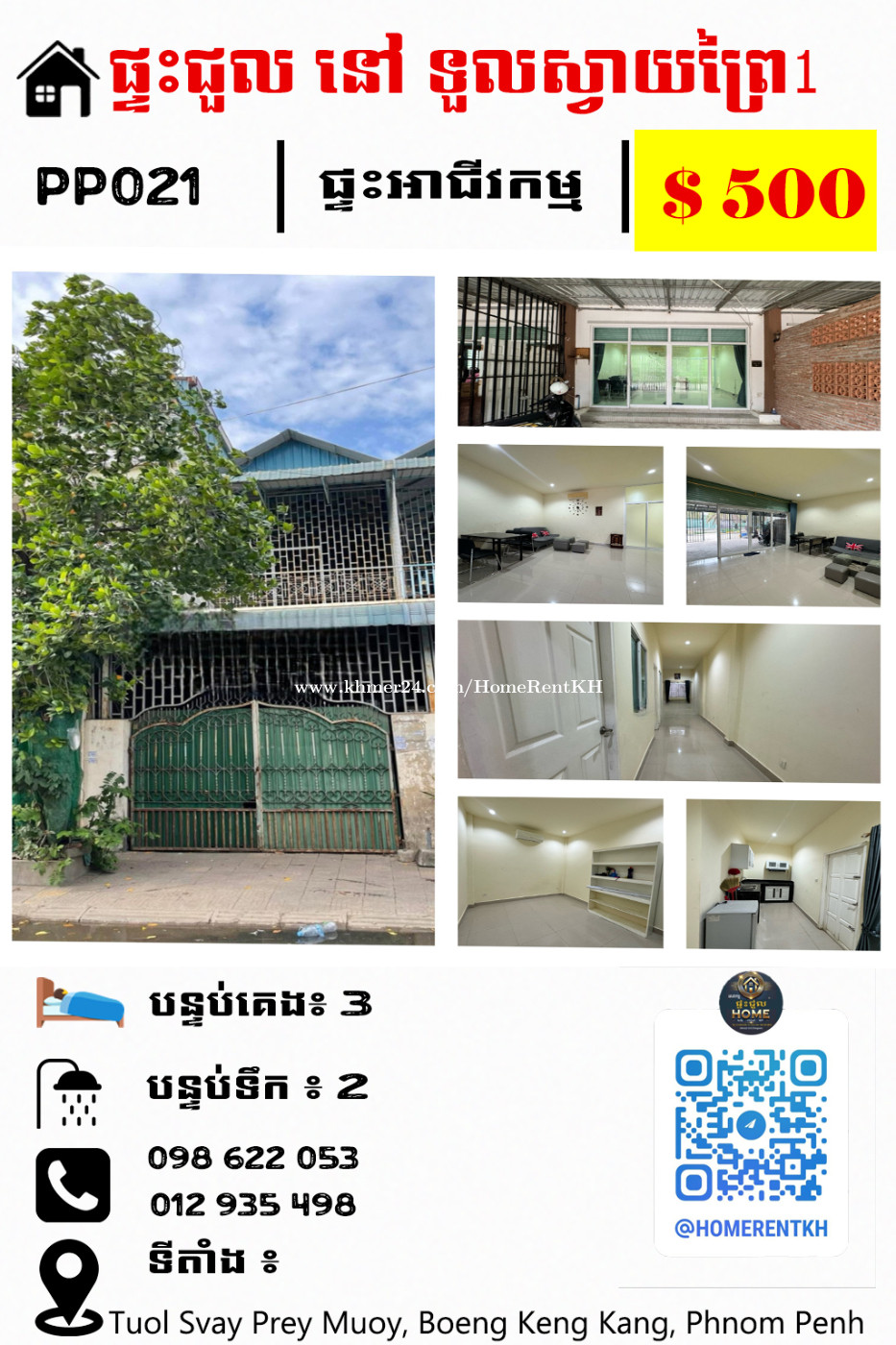 ផ្ទះជួល អាជីវកម្ម នៅទួលស្វាយព្រៃ១ Flat (Tuol Svay Prey 1 – BKK) លើផ្លូវធំ រកស៊ីស្រួល 🏡 ព័ត៌មានទូទៅ 🛏️ Bedroom: 3 🛁 Bathroom: 2 🌅 Facing: North 📐 Size: 125m² 🏠 Type: Flat 💵 តម្លៃជួល: $500/ខែ ✨ លក្ខណៈពិសេស ផ្ទះស្ថិតនៅលើ ផ្លូវធំ ទល់មុខមាន ឃ្លាំងទទួលឥវ៉ាន់ពីវៀតណាម (មនុស្សច្រើន ចេញចូលខ្ពស់) ចំហៀងផ្ទះមាន ក្លឹបហាត់ប្រាណ → តំបន់មានសកម្មភាពខ្លាំង អាចរស់នៅ ឬបើកអាជីវកម្មបាន តំបន់មាន សុវត្ថិភាពខ្ពស់ ព្រោះនៅជិត អធិការដ្ឋានខណ្ឌបឹងកេងកង 📍 ទីតាំង ផ្ទះលេខ Tuol Svay Prey Muoy, Boeng Keng Kang, Phnom Penh 📞 Tel: 098622xxxClick To Call / 012935xxxClick To Call 📲 Telegram: t.me/homerentkh 🏡 មើលផ្ទះជាច្រើនទៀត: t.me/HomeRentService 🆔 Code: PP021 #FlatForRent #BoeungKengKang #TuolSvayPrey #PhnomPenhRental #BusinessLocation