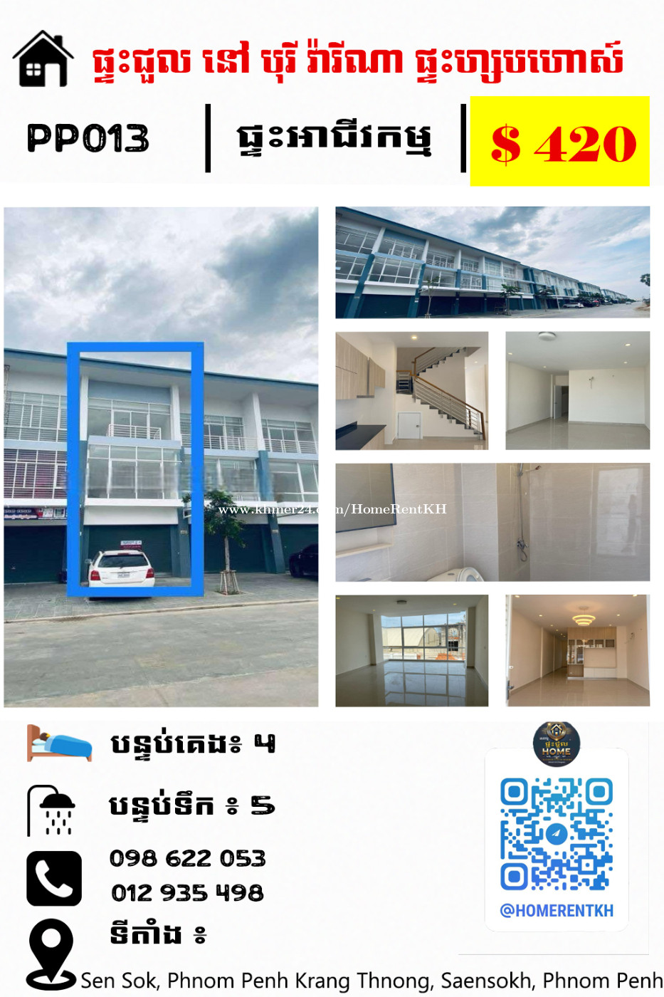 ផ្ទះជួល អាជីវកម្ម នៅបុរី វ៉ារីណា ផ្ទះស្អាត រកស៊ីបានស្រួល Flat (Borey Varina, Sen Sok) 🏡 ព័ត៌មានទូទៅ 💵 តម្លៃជួល: $420/ខែ 📐 ទំហំដី: 4.5m x 19.6m 🏠 ទំហំផ្ទះ: 4.5m x 14m 🛏️ បន្ទប់គេង: 4 🛁 បន្ទប់ទឹក: 5 🏢 កម្ពស់: 3 ជាន់ 🚗 ផ្លូវសាធារណៈ: 16m ✨ លក្ខណៈពិសេស ផ្ទះហ្សបហោស៍ក្នុងបុរីវ៉ារីណា ចំហៀងហាងផ្កាព្រៃ និង សាលាមុំ ក្រាំងធ្នង់ អាចចូលស្នាក់នៅភ្លាម និងសាកសមសម្រាប់ធ្វើអាជីវកម្ម 📍 Location: Krang Thnong, Sen Sok, Phnom Penh 📞 Tel: 098622xxxClick To Call / 012935xxxClick To Call 📲 Telegram: t.me/homerentkh 🏡 មើលផ្ទះជាច្រើនទៀត: t.me/HomeRentService 🆔 Code: PP013 #HouseForRent #BoreyVarina #SenSok #PhnomPenhRental