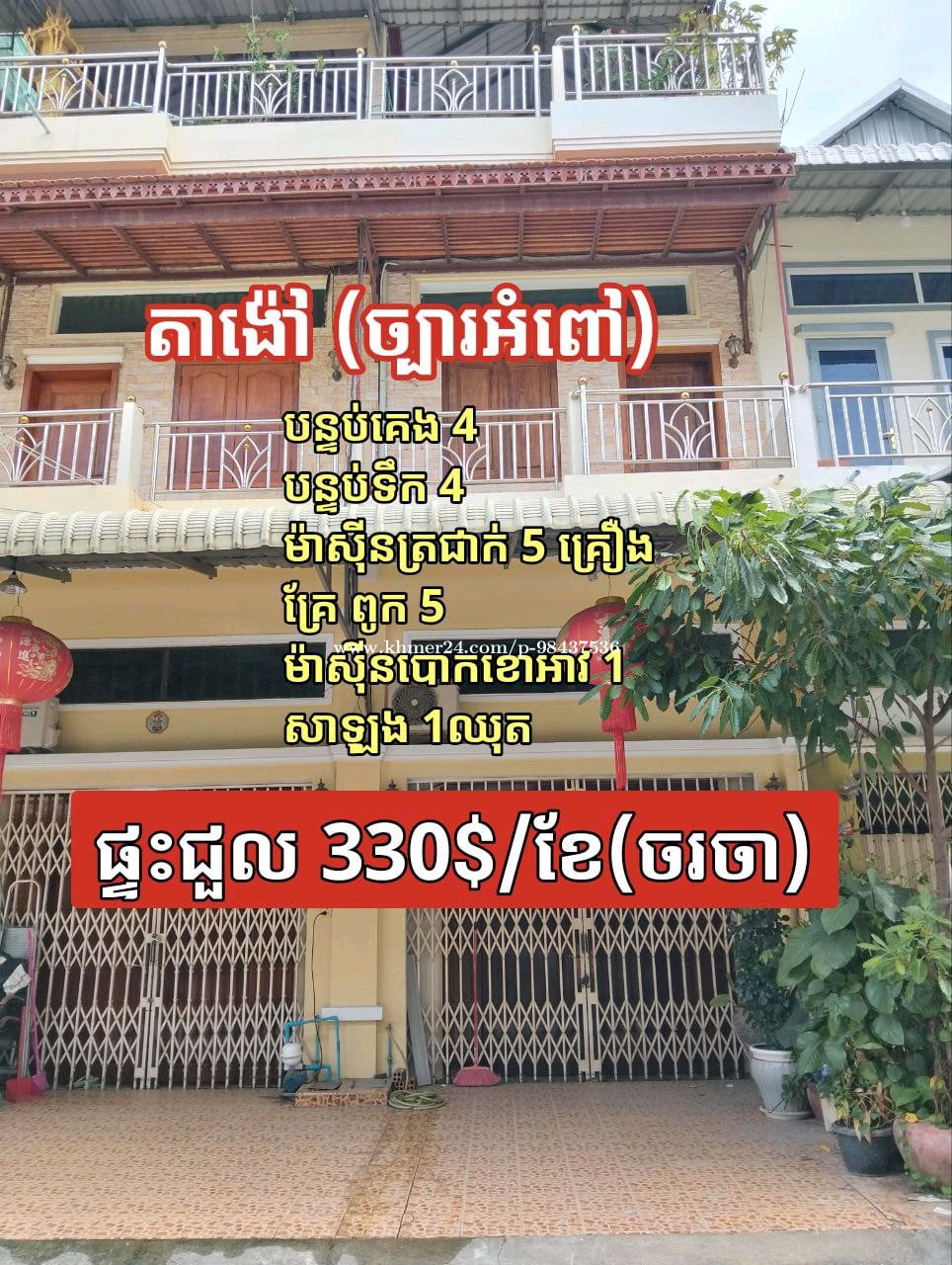 🏠ផ្ទះជួល (ច្បារអំពៅ) 📍ទីតាំង តាង៉ៅ ច្បារអំពៅ (ផ្ទះថ្មីស្អាត មិនលិចទឹក) 💸តម្លៃ 330$/ខែ(ចរចា) ✅បន្ទប់គេង 4 ✅បន្ទប់ទឹក 4 ✅ទំហំផ្ទះ 4m ×15m ✅មានគ្រែពូក 5 ✅ម៉ាសុីនត្រជាក់ 5 គ្រឿង ✅ម៉ាសុីនទឹកក្ដៅ ត្រជាក់ 1គ្រឿង ✅ម៉ាសុីនបោកខោអាវ1 ✅សាឡុង 1ឈុត ✅ទឹកភ្លេីងរដ្ឋ 📝កុងត្រា 1ឆ្នាំ កក់2 បង់1 Code:L.N0004 ☎️ទំនាក់ទំនង៖ 📱092858xxxClick To Call (Cellcard) 📱086442xxxClick To Call (Smart) 📩 Telegram https://t.me/VB8886 https://t.me/VB2272 🙏សូមអរគុណ🙏