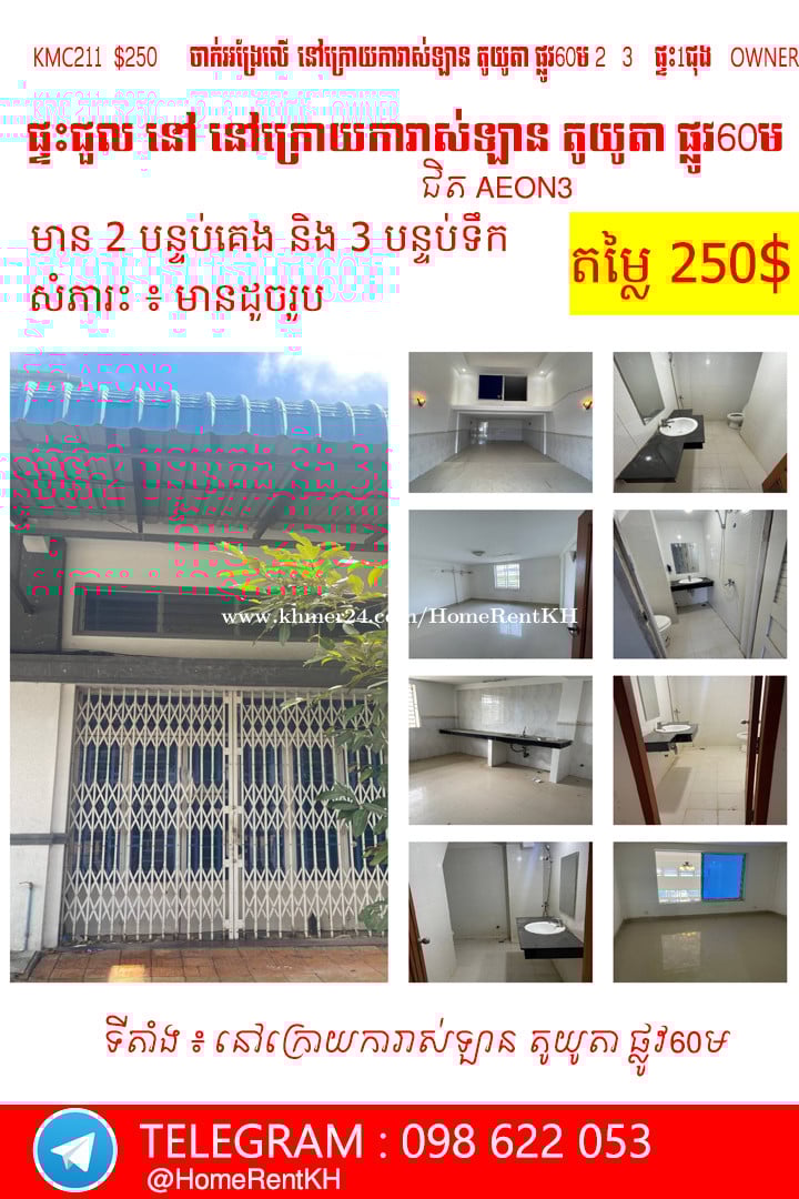 🏠 ផ្ទះជួល នៅ នៅក្រោយការាស់ឡាន តូយូតា ផ្លូវ60ម ជិតផ្សាទំនើប AEON3 Home for rent at Behine TOYOTA 60M near AEON3 • តម្លៃជួល. Price : 250$ • ទីតាំង Location : ចាក់អង្រែ , ខណ្ឌមានជ័យ • បន្ទប់គេង Bedroom : 2 • បន្ទប់ទឹក. Bathroom : 3 👉 ផ្ទះស្អាត : មានផាសុខភាព 👉 សំភារះក្នុងផ្ទះ : គ្មាន 👇ឆាតចូលក្នុងប្រអប់សារតេលេក្រាម ងាយស្រួលផ្ងើររូបភាពនឹងវីដេអូនជូន 098 622 053 ឬ @HomeRentKH 👉 https://t.me/HomeRentKH 👇ចូលក្រុម តាមដាន ពត៍មាន ផ្ទះជួល បន្ទប់ជួល នឹងខុនដូ អាផាតមិន ជាច្រើនទៀត 👉 Channel Property 👉 https://t.me/HomeRentService #ផ្ទះជួល #បន្ទប់ជួល #អាគារជួល #ខុនដូជួល #homeforrent #houseforrent #rent #rentkh #rentcambodia #condoforrent #appartmentforrent #ផ្ទះអាជីវកម្មសម្រាប់ជួល #ផ្ទះជួលសម្រាប់រកស៊ី #បន្ទប់ជួលតម្លៃធូរថ្លៃ #ផ្ទះជួលធូរថ្លៃ #ផ្ទះជួលសម្រាប់ស្នាក់នៅ #renthouse #renthome #ផ្ទះអាជីវកម្ម #ផ្ទះសម្រាប់ជួល #houserenting #househunting #ជួល #ជួលបន្ទប់ #ជួលផ្ទះ #វីឡាទោលសម្រាប់ជួល #ស្វែងរកផ្ទះ #ផ្ទះជួលសម្រាប់ស្នាក់នៅ #ការិយាល័យសម្រាប់ជួល #ឃ្លាំងជួល #វីឡាទោលសម្រាប់ជួល #សម្រាប់ជួល #kmc211