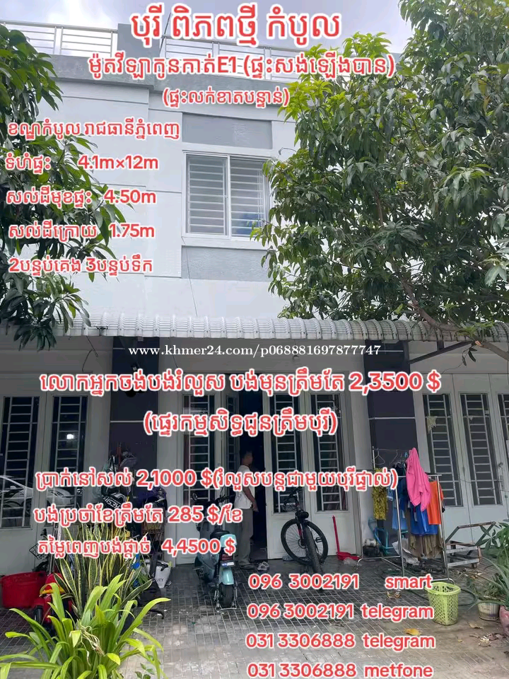 🙏បុរីពិភពថ្មីកំបូល - ផ្ទះលក់ខាត(ក្រោមទីផ្សារខ្លាំង) -បង់មុន 2,3500 $ចចារ (ផ្ទេរកម្មសិទ្ធត្រឹមបុរីជូន) ប្រាក់នៅសល់ 2,1000 $(រំលួសបន្តជាមួយបុរីផ្ទាល់) បង់ប្រចាំខែ 285 $/ខែ ទំហំផ្ទះ 4.1m×12m សល់ដីមុខផ្ទះ 4.50m ស់ដីក្រោយ 1.75m មាន 2បន្ទប់គេង3បន្ទប់ទឹក (ផ្ទះសង់ឡើងបាន) ខណ្ឌកំបូល រាជធានីភ្នំពេញ ព័ត៍មានលម្អិត : 0963002xxxClick To Call smart 0963002xxxClick To Call telegram 0313306xxxClick To Call telegram 0313306xxxClick To Call metfone