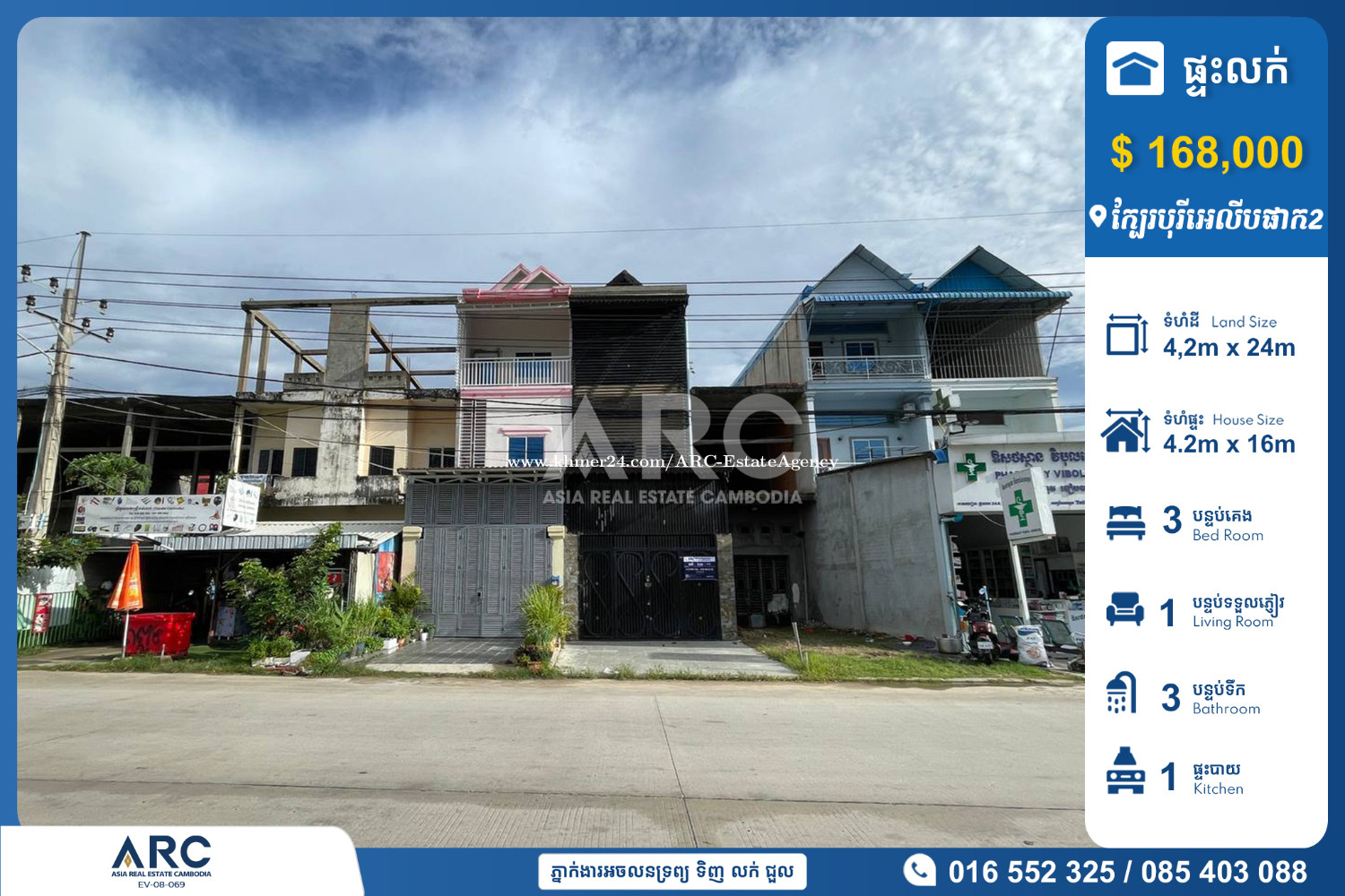 ផ្ទះលក់ នៅផ្លុវមេ១០មរដ្ឋ ក្បែរបុរីភ្នំពេញថ្មីអេលីបផាក២ សង្កាត់ក្រាំងធ្នង់ ខណ្ឌសែនសុខ ភ្នំពេញ - តម្លៃលក់៖ $ 168,000 ចរចា - ទំហំផ្ទះ៖ 4.2m × 16m - ទំហំដី ៖ 4.2m × 24m - សល់មុខ 7ម - បន្ទប់គេង: 3 - បន្ទប់ទឹក: 3 - ជាផ្ទះអាជីវកម្មលើផ្លូវមេរដ្ឋ អាចប្រកបអាជីវកម្មបាន។ - ពត៌មានបន្ថែមសូមទំនាក់ទំនង៖ ☎️ 016552xxxClick To Call / 085403xxxClick To Call 👉Chat: https://t.me/SynaSuy 👉Chanel: https://t.me/AsiaRealEstateCambodia 👉 Website: www.arc.com.kh 👉 អាជ្ញាប័ណ្ណលេខ៖ EV-08-069