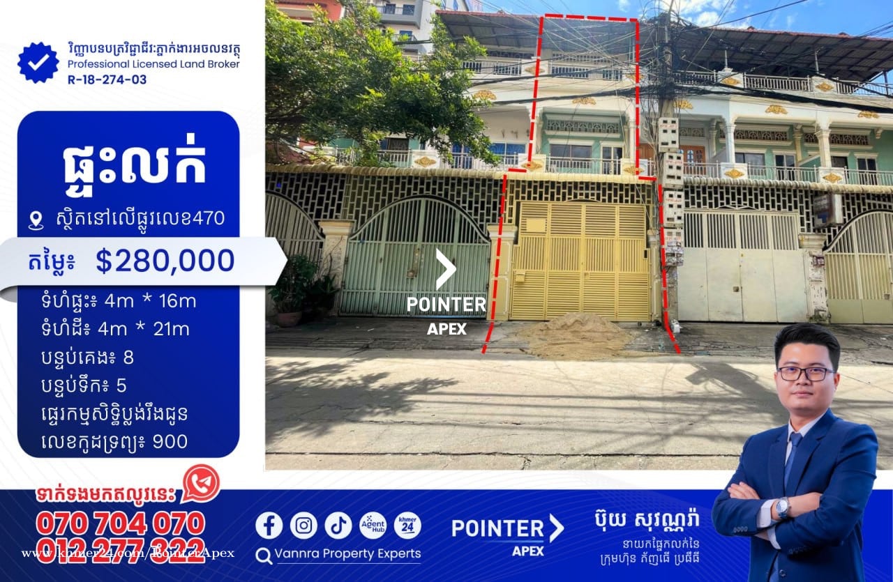 ផ្ទះលក់នៅលើផ្លូវ470 សម្រាប់លក់: $280,000 ទំហំដី: 4m x 21m ទំហំផ្ទះ: 4m x 16m បន្ទប់គេង:8 បន្ទប់ទឹក:5 🔐លេខកូដអចលនវត្ថុ៖ 900 ស្ថិតនៅលើផ្លូវលេខ 470 សង្កាត់ទួលទំពូង2 ខណ្ឌចំការមន ភ្នំពេញ ——————————— ទាក់ទងមកឥលូវនេះ៖ Call: 070704xxxClick To Call / 012277xxxClick To Call Telegram: https://t.me/vannraaa 微信号: vannra-experts - Channel: https://t.me/vannrapropertyexperts - Tiktok: https://www.tiktok.com/@vannra_property_experts - Facebook: https://www.facebook.com/vannra.phnompenh.property/
