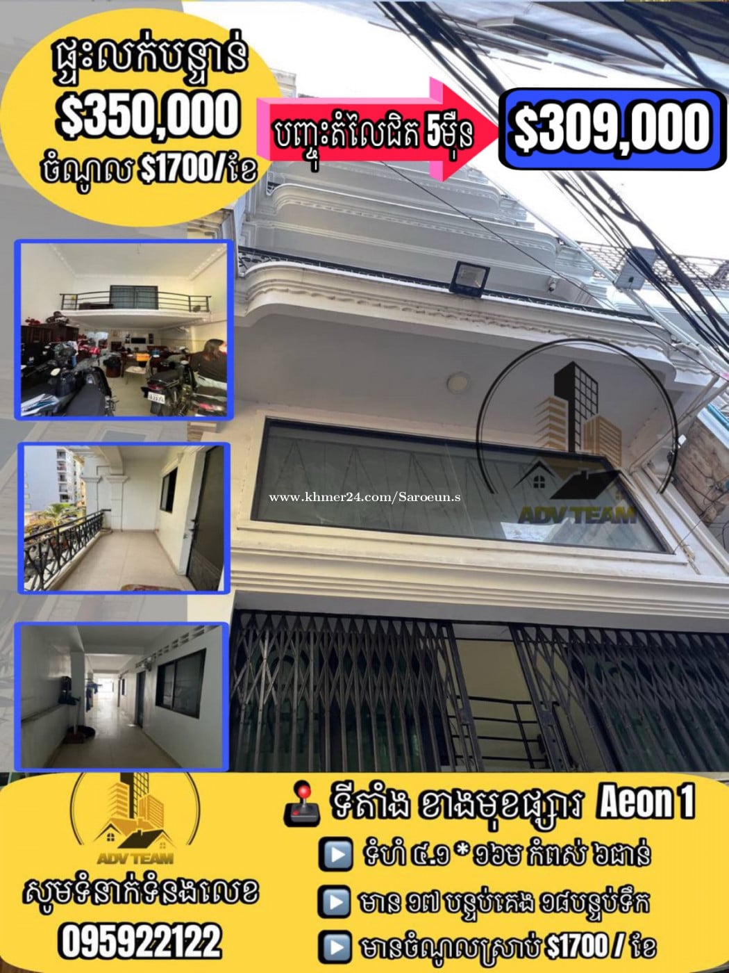 👉 បញ្ចុះតំលៃបន្ថែមជិត 5មុឺនដុល្លា នៅសល់ត្រឹមតែ $309,000 ប៉ុណ្ណោះ (តំលៃទីផ្សារជាង 45មុឺន) 🏦 ផ្ទះលក់បន្ទាន់ នៅខាងមុខ Aeon 1 កំពស់ 6ជាន់ មានចំណូល $2000/ខែ ម្ចាស់ត្រូវការលុយបន្ទាន់ ➡️ ទំហំផ្ទះ៖ 4.2 x 16m ➡️ បន្ទប់គេង17 | បន្ទប់ទឹក 18 ✨ មានភ្ញៀវជួលនៅពេញៗ 👉កាត់ឈ្មោះជូន ប្លង់រឹង 🕹️ ទីតាំង : ស្ថិតនៅទល់មុខផ្សារ Aeon 1 ទន្លេបាសាក ចំការមន ជាតំបន់សក្តានុពលខ្លាំងបំផុតក្នុងក្រុង…. ☎️ 095922xxxClick To Call (Telegram) Code: SH-00046 Telegram : https://t.me/saroeun_avd Channel: https://t.me/snrealestate