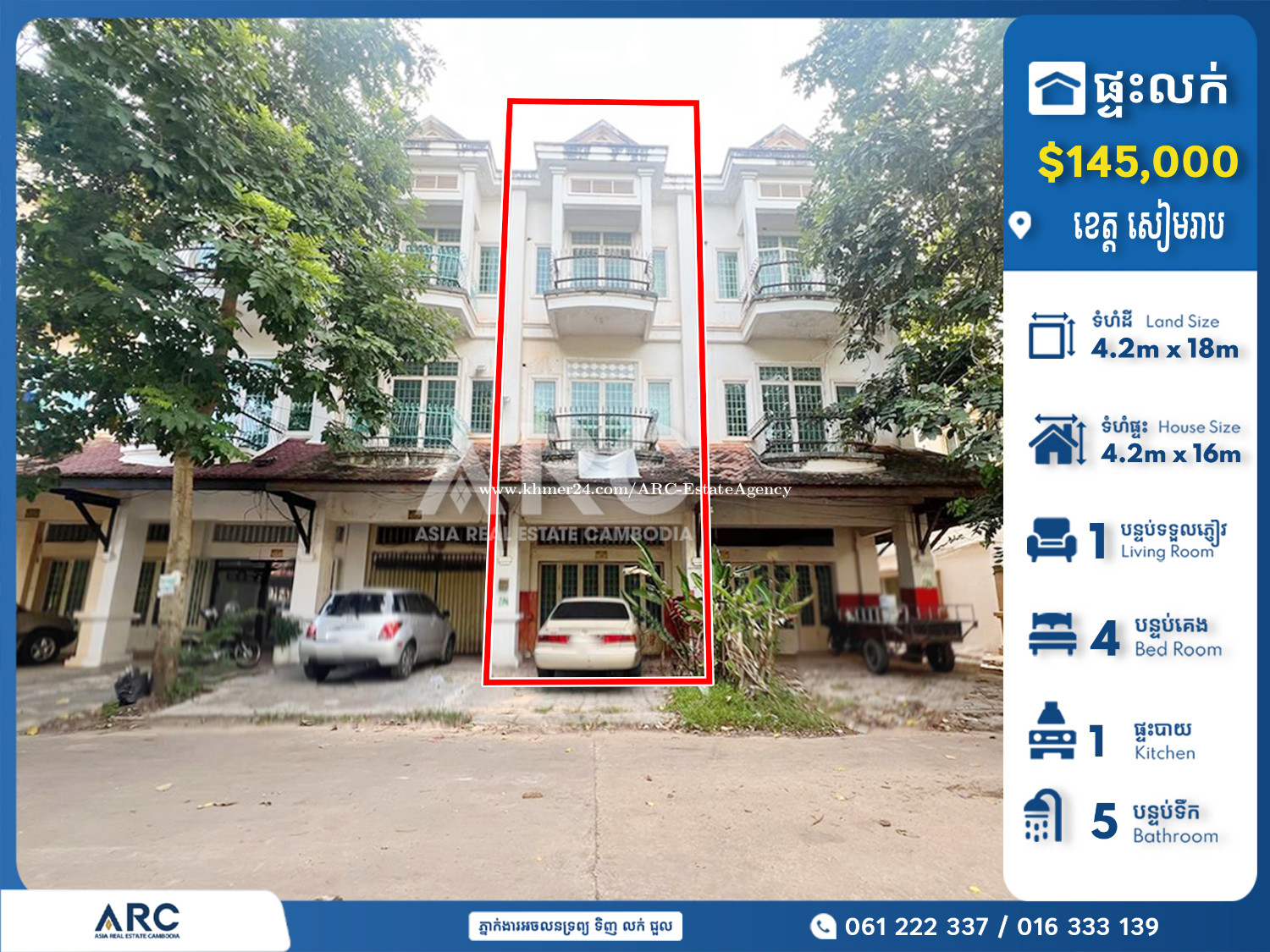 ផ្ទះល្វែងលក់: ■ ទំហំដី៖ 4.2m x 18m=75ម៉ែត្រការ៉េ ■ ទំហំផ្ទះ៖ 4.2m x 16m x 3ជាន់ ( ប្លង់សេ 3សន្លឹក ) ■ ជាន់ផ្ទាល់ដី ជាន់ទី1 ជាន់ទី2 និងមានដំបូលជាន់ទី 3 ■ ផ្ទះបាយ៖ 1 ■ បន្ទប់គេង៖ 4 បន្ទប់ទឹក 5 ■ កន្លែងទទួលភ្លៀវ៖ 1 ■ ចំណតឡាន៖ ខាងមុខ ■ តម្លៃលក់៖ $145,000 ■ ទីតាំង៖ ក្រុង និងខេត្តសៀមរាប » Flat for Sale is in Siem Reap City ■ Land size: 4.2m x 18m=75sqm ■ House size : 4.2m x 16m x 3floor ■ Bedroom : 4 ■ Bathroom: 5 ■ Living Area: 1 ■ Kitchen: 1 ■ Parking Lot: Front ■ For Sale : $145,000 ■ Location Property : Siem Reap City ,Siem Reap Province. - ពត៌មានបន្ថែមសូមទំនាក់ទំនង / For more detail៖ ☎️ 016 333139 (Smart) / 061222337 (Cellcard) 👉Personal Telegram Agent: https://t.me/arcsiemreap 👉 Website: www.arc.com.kh 👉 អាជ្ញាប័ណ្ណ៖ EV-08-069