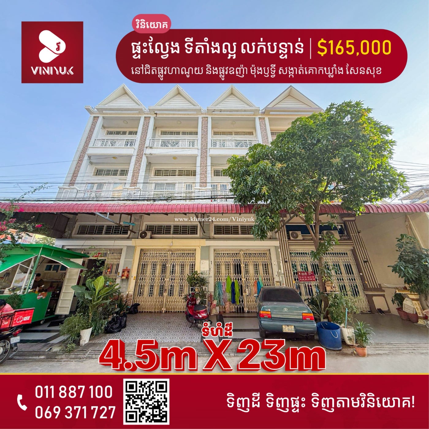 🏡ផ្ទះល្វែង សម្រាប់លក់!! 📍ទីតាំង ៖ នៅជិតផ្លូវហាណូយ និងផ្លូវឧញ៉ា ម៉ុងឫទ្វី សង្កាត់គោកឃ្លាង ខណ្ឌសែនសុខ រាជធានីភ្នំពេញ - តម្លៃលក់ : $165,000 ចរចា - ទំហំដី : 4.5m x 23m (ទំហំក្នុងប្លង់រឹង103ម៉ែត្រការ៉េ) - ទំហំផ្ទះ : 4.5m x 17m - សល់មុខ4m, សល់ក្រោយ2m - បន្ទប់គេង 5,បន្ទប់ទឹក 6 - ប្លង់រឹង - ផ្លូវមុខដី 8m - ទិសបែរទៅជើង - លេខអាជ្ញាប័ណ្ណ : E-22-404