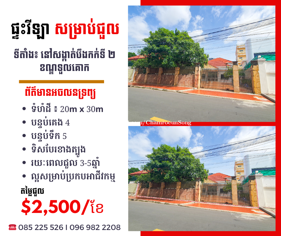 ផ្ទះវីឡា សម្រាប់ជួល!! ⛳️ទីតាំង: ស្ថិតនៅសង្កាត់បឹងកក់ទី2 ខណ្ឌទួលគោក - តម្លៃជួល : $2,500/ខែ - ទំហំដី : 20m x 30m - មានបន្ទប់ 4 , បន្ទប់ទឹក 5 - កុងត្រា 3-5ឆ្នាំ - បែរទិសខាងត្បូង ☎️សម្រាប់ព័ត៌មានលម្អិត: 0969822xxxClick To Call | 085225xxxClick To Call Telegram https://t.me/Chamroeun_Song សូមអរគុណ!!