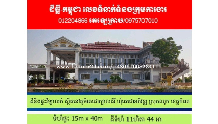 #មានផ្ទះវីឡាធំសំរាប់លក់ ដីធ្លី កម្ពុជា 012204xxxClick To Call Telegram Land for sale with big villa for sale in Chhouk district, Kampot province. 1. តម្លៃ 1,5 លានដុល្លាអាមេរិក(ប្លង់រឹង) 2. ទំហំដី 11ហិតា 44 អា 3. ទំហំផ្ទះ 15m x 40m 4. មាន 10 បន្ទប់គេង ចង្រ្កានបាយ 1 អាងត្រាំទឹក1 5. មានវេរ៉ង់ដាជុំវិញផ្ទះ វេរ៉ង់ដាធំខាងមុខផ្ទះ 6. មានប្រព័ន្ធទឹករដ្ឋ ភ្លើងរដ្ឋ រួចស្រាប់ 7. ទេសភាពលើកំពូលភ្នំធានាស្អាត !!! 8. ទីតាំងស្ថិតនៅ ភូមិតេជោក្បាលដំរី ឃុំតេជោអភិវឌ្ឍ ស្រុកឈូក ខេត្តកំពត។ 💁សំរាប់ព័ត៌មានលំអិតផ្សេងៗ៖(ទទួលសិទ្ធិជួយលក់ផ្ដាច់មុខ) ☎️ 012204xxxClick To Call មានTeegram 0975707xxxClick To Call Video Land and villa for sale in Chhouk district, Kampot province 1. $ 1.5 million 2. Land size 11 hectares, 44 acres 3. House size 15m x 40m 4. There are 10 bedrooms, 1 kitchen, 1 bathtub. 5. There is a veranda around the house, a large veranda in front of the house 6. There is already a state water and electricity system 7. Mountain view 8.The location is in Techo Kbal Damrey village, Techo Aphivath commune, Chhouk district, Kampot provinc #ទេសភាពលើកំពូលភ្នំ #ផ្លូវជាតិលេខ៤ #ឃុំតេជោអភិវឌ្ឍ #ស្រុកឈូក #ខេត្តកំពត #ផ្ទះលំហែរលក់