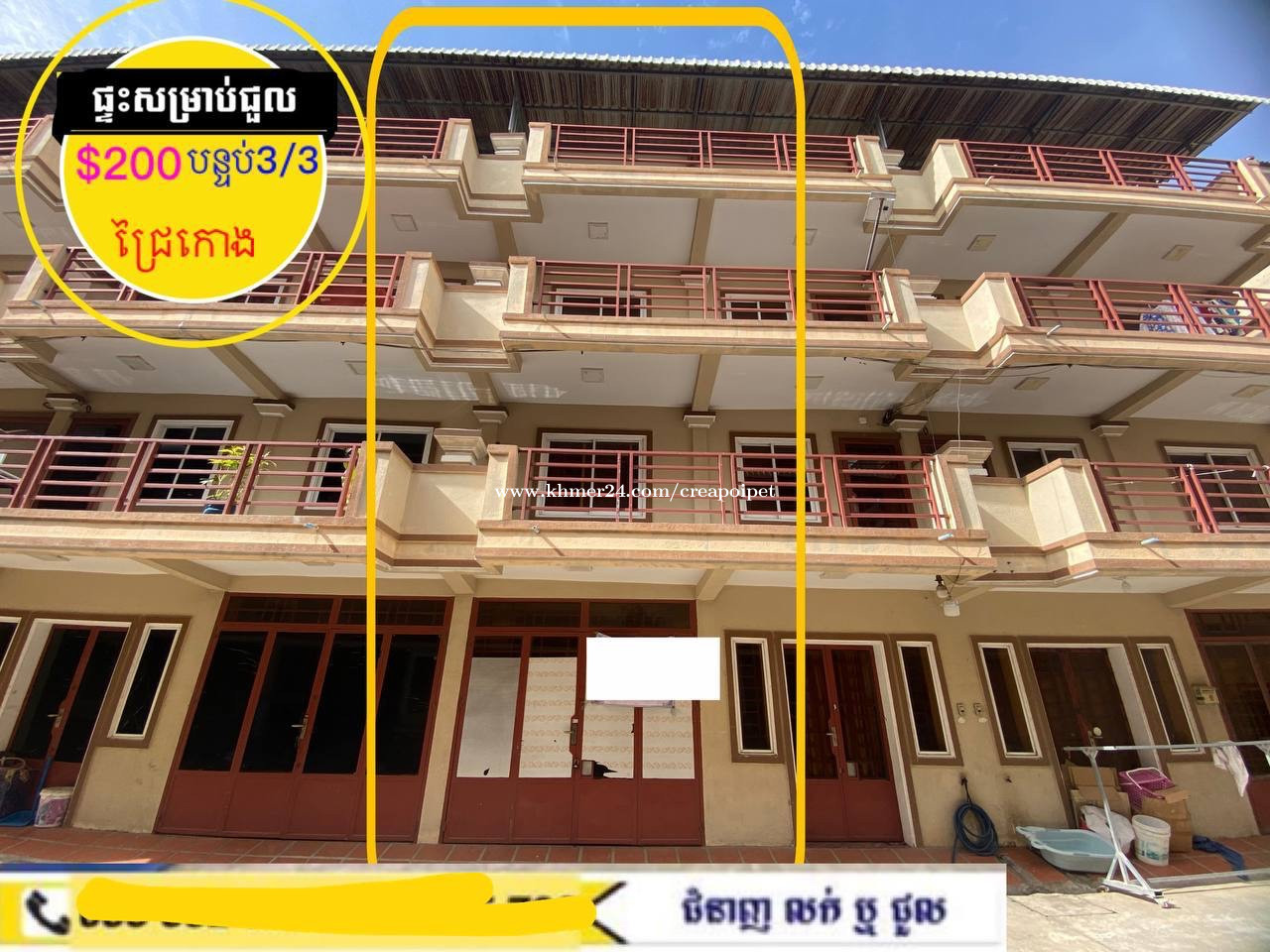 #ផ្ទះសម្រាប់ជួល ក្នុងបុរី ក្បែរផ្លូវរដ្ឋ ជ្រៃកោង ក្បែរផ្លូវ វេងស្រេង -តំលៃជួល$200 -បន្ទប់គេង3,បន្ទប់ទឹក3 -ខ្នាតផ្ទះ6ឞ x 8ឞ 👉ទីតាំង: ក្បែរផ្លូវធំ ផ្លូវ 20មថ្មី ជ្រៃកោង ☎️ 070418xxxClick To Call | 078418xxxClick To Call Telegram : https://t.me/Sienghai 1. SIENGHAI Channel : https://t.me/sienghaioucrea 2. HOUSE SALE : https://t.me/creasale 3. HOUSE RENT : https://t.me/crearent 4. Condo & Apartment : https://t.me/creaozone 5. Commercial Bulding : https://t.me/creabizzone 6. LAND : https://t.me/CREAAILAND