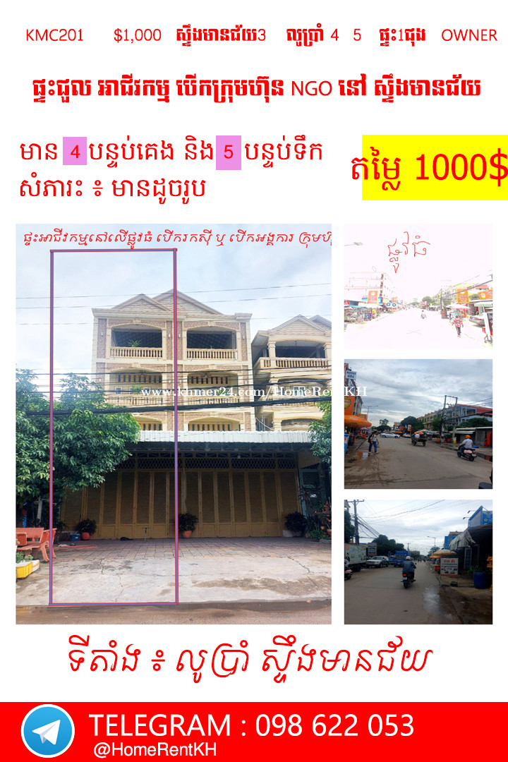 🏠 ផ្ទះសម្រាប់ជួល បែបអាជីវកម្ម បើកអង្គការ ក្រុមហ៊ុន នៅ លូប្រាំ ផ្លូវធំ ស្ទឹងមានជ័យ Home Business for rent at Steng Mean Chhey • តម្លៃជួល. Price : 1,000$ • ទីតាំង Location : ផ្លូវធំ លូប្រាំ , ស្ទឹងមានជ័យ , ខណ្ឌមានជ័យ • បន្ទប់គេង Bedroom : 4 • បន្ទប់ទឹក. Bathroom : 5 👉 ផ្ទះស្អាត : មានផាសុខភាព 👉 សំភារះក្នុងផ្ទះ : គ្មាន 👇ឆាតចូលក្នុងប្រអប់សារតេលេក្រាម ងាយស្រួលផ្ងើររូបភាពនឹងវីដេអូនជូន 098 622 053 ឬ @HomeRentKH 👉 https://t.me/HomeRentKH 👇ចូលក្រុម តាមដាន ពត៍មាន ផ្ទះជួល បន្ទប់ជួល នឹងខុនដូ អាផាតមិន ជាច្រើនទៀត 👉 Channel Property 👉 https://t.me/HomeRentService #ផ្ទះជួល #បន្ទប់ជួល #អាគារជួល #ខុនដូជួល #homeforrent #houseforrent #rent #rentkh #rentcambodia #condoforrent #appartmentforrent #ផ្ទះអាជីវកម្មសម្រាប់ជួល #ផ្ទះជួលសម្រាប់រកស៊ី #បន្ទប់ជួលតម្លៃធូរថ្លៃ #ផ្ទះជួលធូរថ្លៃ #ផ្ទះជួលសម្រាប់ស្នាក់នៅ #renthouse #renthome #ផ្ទះអាជីវកម្ម #ផ្ទះសម្រាប់ជួល #houserenting #househunting #ជួល #ជួលបន្ទប់ #ជួលផ្ទះ #វីឡាទោលសម្រាប់ជួល #ស្វែងរកផ្ទះ #ផ្ទះជួលសម្រាប់ស្នាក់នៅ #ការិយាល័យសម្រាប់ជួល #ឃ្លាំងជួល #វីឡាទោលសម្រាប់ជួល #សម្រាប់ជួល #kmc201