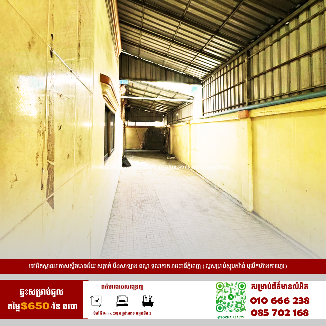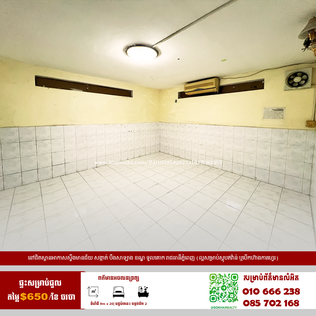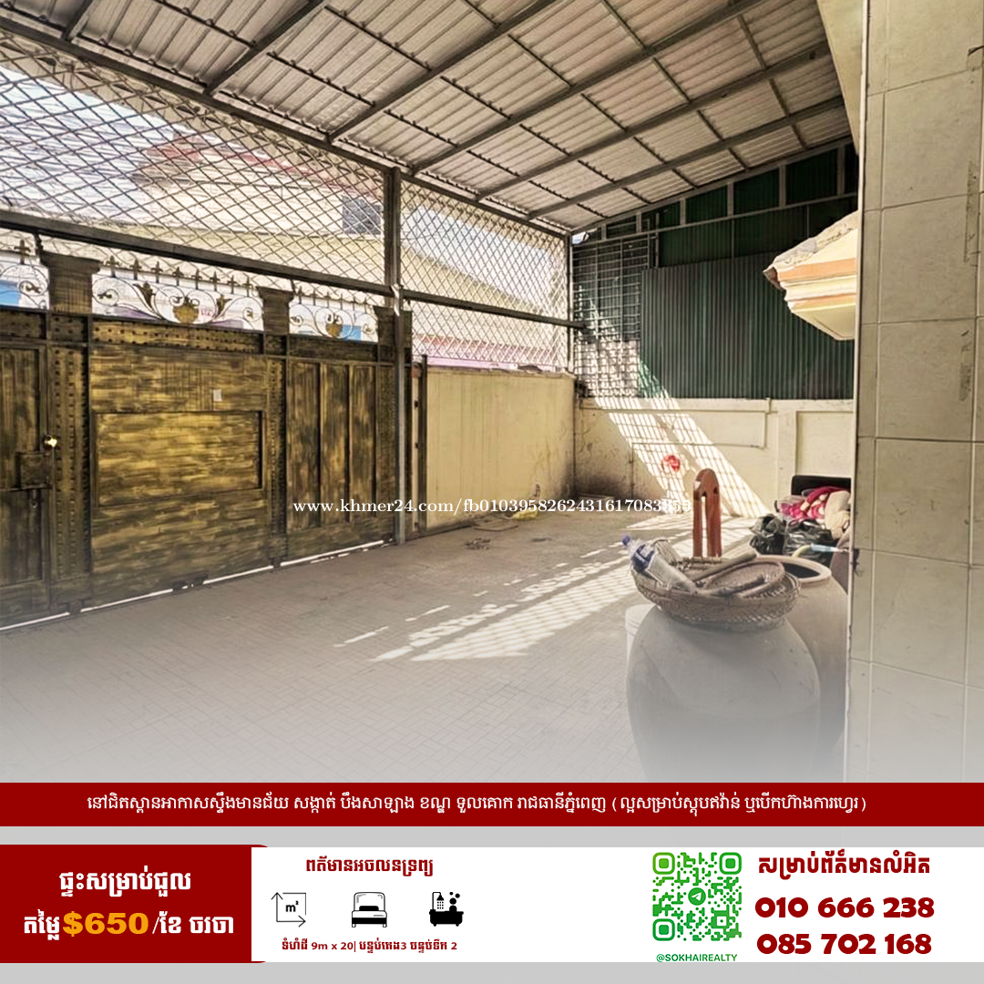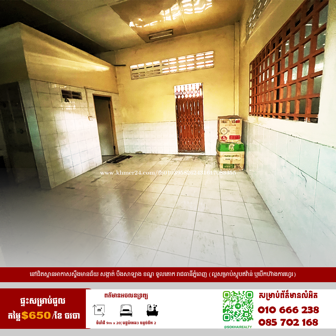 ផ្ទះសម្រាប់ជួល ស្ថិតនៅជិតស្ពានអាកាសស្ទឹងមានជ័យ ល្អសម្រាប់រស់នៅឬបើកអាជីវកម្មបាន ********************** តម្លៃជួល $650/ខែ ចរចា Rent Price $650/month ◈━━━━━━━━━━━━◈ ទំហំដីLand Size: 9mx 20m ទំហំផ្ទះHome Size: 6mx15m បន្ទប់គេងBedroom: 3 បន្ទប់ទឹកBathroom:2 📍ទីតាំងស្ថិននៅ សង្កាត់ បឹងសាឡាង ខណ្ឌ ទួលគោក ភ្នំពេញ ◈━━━━━━━━━━━━◈ 📍សូមចូលទៅកាន់𝗧𝗲𝗹𝗲𝗴𝗿𝗮𝗺 𝗖𝗵𝗮𝗻𝗻𝗲𝗹ពេលនេះ ដើម្បីស្វែងរកអចលនទ្រព្យពិសេសផ្សេងទៀត៖ 🔗 𝐓𝐞𝐥𝐞. 𝐂𝐡𝐚𝐧𝐧𝐞𝐥:𝗵𝘁𝘁𝗽𝘀://𝘁.𝗺𝗲/𝗦𝗼𝗸𝗵𝗮𝗶𝗥𝗲𝗮𝗹𝘁𝘆 ☎️ 𝗧𝗲𝗹𝗲𝗴𝗿𝗮𝗺:𝟬𝟭𝟬 𝟲𝟲𝟲 𝟮𝟯𝟴 ☎️ 𝗧𝗲𝗹𝗲𝗴𝗿𝗮𝗺:𝟬𝟴𝟱 𝟳𝟬𝟮 𝟭𝟲𝟴