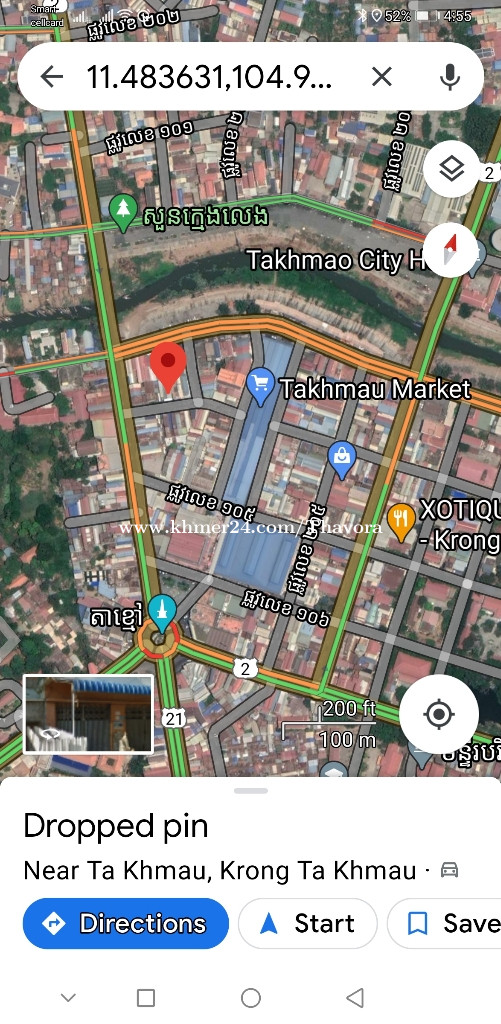 ផ្ទះមានទីតាំងខាងលិចផ្សារតាខ្មៅចាស់ ក្រុងតាខ្មៅ ខេត្តកណ្តាល។ ផ្ទះ ២ ល្វែងជាប់គ្នា ជាន់ផ្ទាល់ដី និងជាន់ទី១ សម្រាប់ព័ត៌មានលម្អិត សូមទាក់ទងទូរស័ព្ទលេខ ០៩៦៥១៥៦៦៩៩