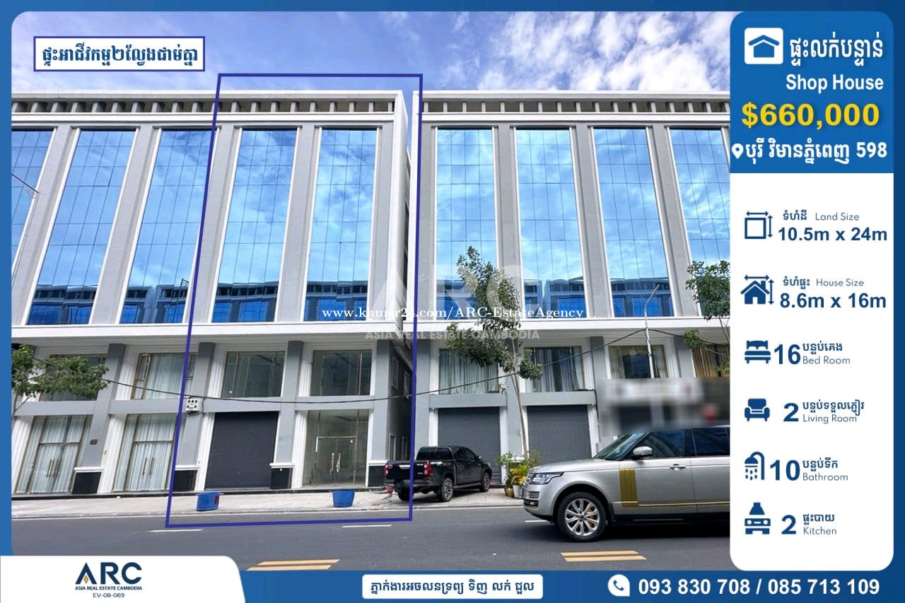 #Shop House For Sale at Borey Vimean Phnom Penh 598 #ផ្ទះអាជីវកម្ម២ល្វែងដាក់លក់បន្ទាន់នៅក្នុងបុរី វិមានភ្នំពេញ 598 ជិតផ្សារទំនេីបអុីអន២ 🔹 តម្លៃលក់ក្រោមទីផ្សារ $660,000 (ចរចាម្ចាស់ផ្ទាល់) 🔹 ទំហំដី : 10.5m x 24m 🔹 ទំហំផ្ទះ : 8.6m x 16m 🔹 បន្ទប់គេង : 16 បន្ទប់ទឹក : 10 📍ទីតាំងត្រឹមតែ05នាទីពីផ្សារទំនើប AEON2 Makro សង្កាត់ច្រាំងចំរេះទី២ ,ខណ្ឌឬស្សីកែវ ,រាជធានីភ្នំពេញ សម្រាប់ពត៏មានលម្អិតសូមទំនាក់ទំនងមកក្រុមការងារ 085713xxxClick To Call / 093830xxxClick To Call / 0978899xxxClick To Call Chat to Telegram Agent https://t.me/sonsela14 Channel Telegram https://t.me/ARCKhanResseykeo 👉 អាជ្ញាប័ណ្ណ៖ EV-08-069