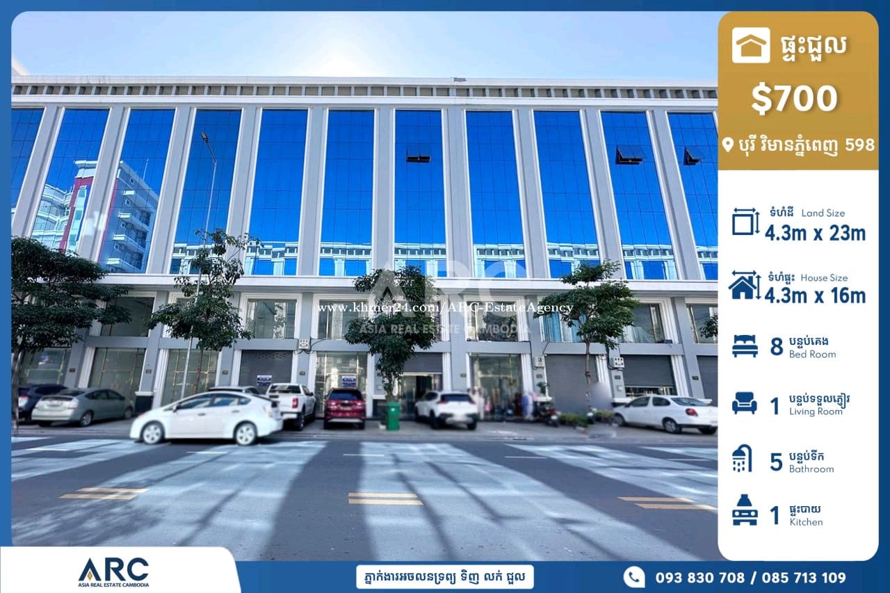 #Shop House For Rent at Borey Vimean Phnom Penh 598 #ផ្ទះអាជីវកម្មដាក់ជួលនៅក្នុងបុរី វិមានភ្នំពេញ 598 ជិតផ្សារទំនេីបអុីអន២ 🔹 តម្លៃជួល / Rent Price $700 ( ចរចាម្ចាស់ផ្ទាល់ ) 🔹 ទំហំផ្ទះ/ House size: 4.3m x 16m 🔹 ទំហំដី / land size: 4.3m x 23m 🔹 បន្ទប់គេង/ Bedroom: 08 🔹 បន្ទប់ទឹក/ Bathroom: 05 #永旺2附近 出租价格:$700 美金/可谈 房间数量:08房 , 05卫 配套设施:家具齐全 建筑面积:4.3米 X 16米 土地面积:4.3米 X 23米 085713xxxClick To Call / 093830xxxClick To Call / 0978899xxxClick To Call Chat to Telegram Agent https://t.me/sonsela14 Channel Telegram https://t.me/ARCKhanResseykeo 👉 អាជ្ញាប័ណ្ណ៖ EV-08-069