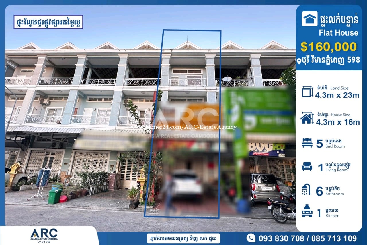 #Flat House For Sale at Borey Vimean Phnom Penh 598 #ផ្ទះល្វែងផ្លូវផ្សារដាក់លក់បន្ទាន់នៅក្នុងបុរី វិមានភ្នំពេញ 598 ជិតផ្សារទំនេីបអុីអន២ 🔹 តម្លៃលក់ :$160,000 (ចរចាម្ចាស់ផ្ទាល់) 🔹 កាត់ឈ្មោះប្លង់រឹងជូន 🔹 ទំហំដី : 4.3m x 23m 🔹 ទំហំផ្ទះ : 4.3m x 16m 🔹 បន្ទប់គេង : 05 បន្ទប់ទឹក : 06 📍ទីតាំងត្រឹមតែ07នាទីពីផ្សារទំនើប AEON2 Makro សង្កាត់ច្រាំងចំរេះទី១ ,ខណ្ឌឬស្សីកែវ ,រាជធានីភ្នំពេញ សម្រាប់ពត៏មានលម្អិតសូមទំនាក់ទំនងមកក្រុមការងារ 085713xxxClick To Call / 093830xxxClick To Call / 0978899xxxClick To Call Chat to Telegram Agent https://t.me/sonsela14 Channel Telegram https://t.me/ARCKhanResseykeo 👉 អាជ្ញាប័ណ្ណ៖ EV-08-069