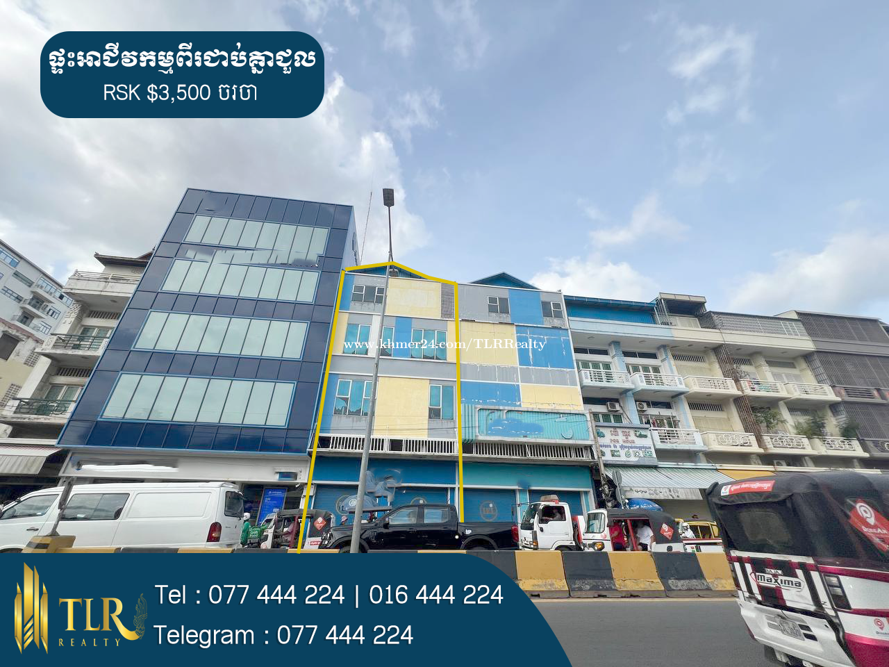 🏢ផ្ទះអាជីវកម្មពីរជាប់គ្នាសម្រាប់ជួល | Two Shophouses for Rent 💲តម្លៃជួល | Price Rent : $3,500 ចរចា - ទំហំអគារ | Building Size : 8m x 20m - បន្ទប់គេង | Bedroom: 18 - បន្ទប់ទឹក | Bathroom : 2 - កម្ពស់ | Height : 3 - ផ្ទះបែរទិសទៅត្បូង | Facing to South 📍ទីតាំងស្ថិតនៅ ជិតគល់ស្ពានជ្រោយចង្វា សង្កាត់ទួលស្លែង ខណ្ឌឬស្សីកែវ រាជធានីភ្នំពេញ | Located in Koh Pich Phnom Penh. # អត្តលេខអាជ្ញាប័ណ្ណ : E-24-449 📞 Cellcard : 077444xxxClick To Call 📞 Smart : 016444xxxClick To Call 📞 Metfone : 066444xxxClick To Call 📱 Telegram : 077444xxxClick To Call 📱 Channel telegram : https://t.me/RithyTLR
