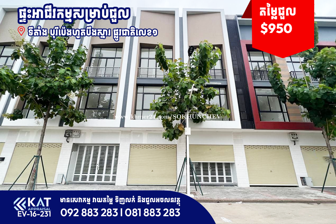ផ្ទះអាជីវកម្មសម្រាប់ជួល | Shophouse For Rent - តម្លៃជួល | Rent Price : 950$ ចរចា - ទំហំដី | Land Size : 4.2m X 17m - ទំហំផ្ទះ | Home Size : 4.2m X 10m - បន្ទប់គេង | Bedroom: 4 - បន្ទប់ទឹក | Bathroom: 5 -សម្ភារៈពេញ | Full Finished -ម៉ាសុីនត្រជាក់/ AC: 5 -ទឹកក្តៅទឹកត្រជាក់/heater water: 4 -សាឡុង/ Sofa: 1ឈុត -ទូរទឹកកក/ Fridge: 1 -ម៉ាស៉ីនបោក/washing machine: 1 -វំាងនន/ Curtain full -គ្រែគេងពូក/ Bed&Mattress: all room -ទូសំលៀកបំពាក់គ្រប់បន្ទប់/ Cabinet all room -ទីតាំង/ Location: បុរីប៉េងហួតបឹងស្នោ គម្រោងអេកូសាន់រ៉ាយ សង្កាត់វាលស្បូវ ខណ្ឌច្បារអំពៅ។ Tel: 092883xxxClick To Call l 081883xxxClick To Call Telegram Chat : https://t.me/katappraisalsupport Telegram Channel : https://t.me/KAT_APPRAISAL