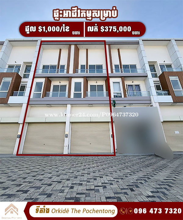 * តម្លៃលក់ | Selling Price: $375,000 (ចចារ | Negotiable) * តម្លៃជួល | Rental Price $1,000/ខែ (ចចារ | Negotiable) * ទំហំផ្ទះ | House Size: 4.5m x 18m * ទំហំដី | Land Size: 4.5m x 22m * បន្ទប់គេង | Bedrooms: 4 * បន្ទប់ទឹក | Bathrooms: 6 * Location | ទីតាំង: Orkidē The Pochentong _________________________ Property Code: (9133)