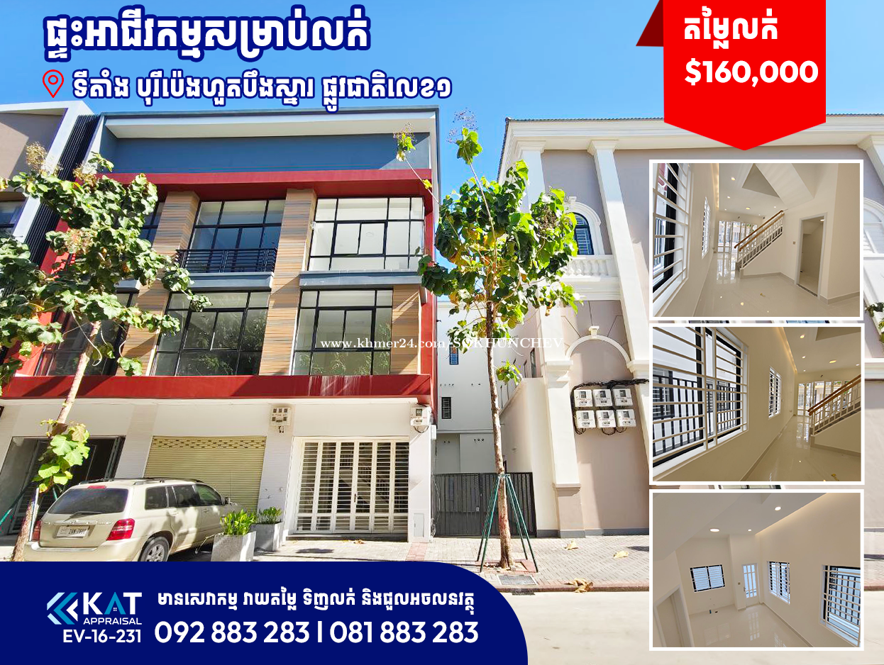 ផ្ទះអាជីវកម្មសម្រាប់លក់ | Shophouse For Sale -បុរីប៉េងហួតបឹងស្នោ អេកូសាន់រ៉ាយ, Sunrise - តម្លៃលក់ | Sale Price: $160,000 - ទំហំដី | Land Size: 4.2m x 17.5m - ទំហំផ្ទះ | House Size: 4.2m x 10m -សល់ដីមុខ5m | ខាងក្រោយ 2m - បន្ទប់គេង | Bedroom: 4 - បន្ទប់ទឹក | Bathroom: 5 - ប្លង់រឹង| Hard Title. - ទីតាំង/ Location: ភូមិស្វាយតាអុក,សង្កាត់វាលស្បូវ,ខណ្ឌច្បារអំពៅ,រាជធានីភ្នពេញ។ Tel: 092883xxxClick To Call l 081883xxxClick To Call Telegram Chat : https://t.me/katappraisalsupport Telegram Channel : https://t.me/KAT_APPRAISAL