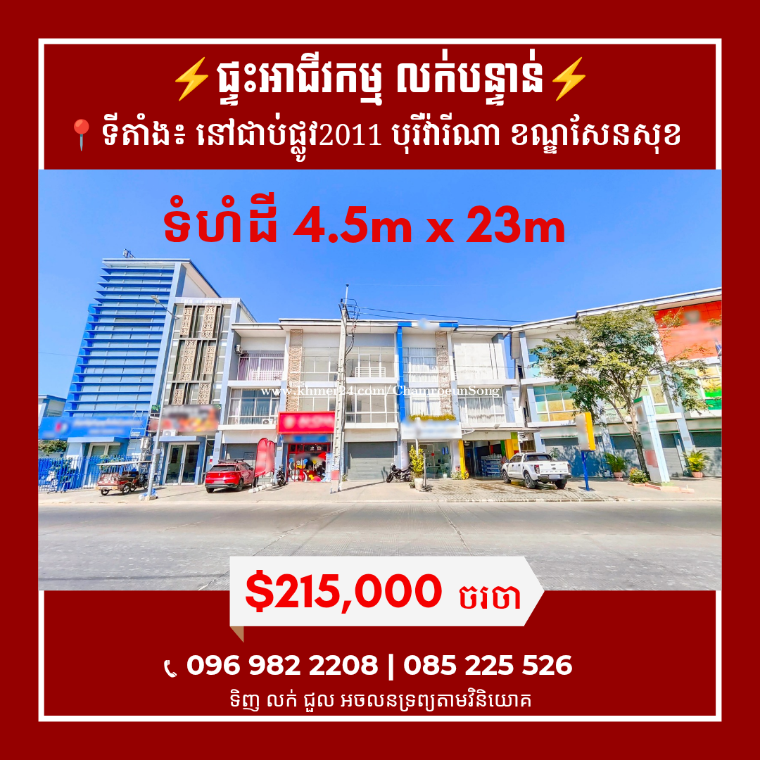 ផ្ទះអាជីវកម្ម លក់បន្ទាន់!! 📍ទីតាំង៖ នៅជាប់ផ្លូធំ បុរីវ៉ារីណា ដឹស្ទាយសែនសុខ សង្កាត់ក្រាំងធ្នង់ ខណ្ឌសែនសុខ 💲តម្លៃលក់ : $215,000 ចរចា 🔹️ទំហំដី : 4.5m x 23.5m 🔹️ទំហំផ្ទះ : 4.5m x 16m 🔹️បន្ទប់គេង 4 , បន្ទប់ទឹក 5 🔹️ប្លង់រឹង 🆔️VYVNVD2 📲សម្រាប់ព័ត៌មានលម្អិត ៖ 0969822xxxClick To Call | 085225xxxClick To Call Telegram: https://t.me/Chamroeun_Song Join Channel: https://t.me/houseforrent_PP សូមអរគុណ!