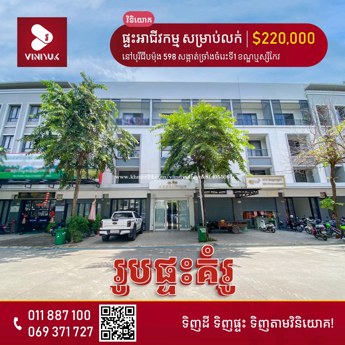 🏡ផ្ទះអាជីវកម្ម សម្រាប់លក់ លើផ្លូវភ្លោះ!! 📍ទីតាំង ៖ នៅបុរីជីបម៉ុង 598 សង្កាត់ច្រាំងចំរេះទី1 ខណ្ឌឬស្សីកែវ រាជធានីភ្នំពេញ - តម្លៃ : $220,000 ចរចា - ទំហំដី : 4.2m x 24m - ទំហំផ្ទះ : 4.2m x 16m - បន្ទប់គេង 5, បន្ទប់ទឹក 6 - ផ្ទេរកម្មសិទ្ធិ : ប្លង់រឹងជូន - ផ្ទះមានដេគ័រស្រាប់ ស្អាត - ទីតាំងល្អសម្រាប់ការស្នាក់នៅ&បើកអាជីវកម្ម មានមនុស្សរស់នៅច្រើនកុះករ - សម្ភារ:មិនមាន - ទិស លិច - លេខអាជ្ញាប័ណ្ណ : E-22-404