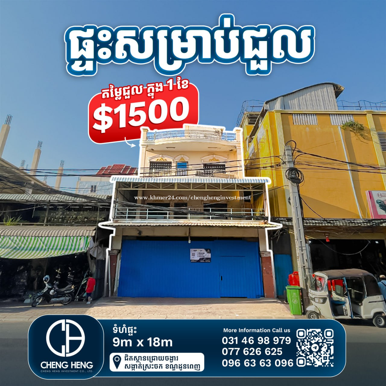 **ផ្ទះអាជីវកម្ម សម្រាប់ជួលនៅជ្រោយចង្វារ តម្លៃ 1500$/ខែ ចរចា Shophouse For Rent at chrouy chongvar 1500$/Month Nego -ទំហំដី/Land Size 9m x 22m -ទំហំផ្ទះ/House size 8m x 14m -បន្ទប់គេង/Bedrooms 5 -បន្ទប់ទឹក/Bathrooms 7 -ជាន់/Floor E0-E2 -សល់ចំហៀង/Behind 1m -សល់ខាងមុខ/Front Space 7.5m *ផ្ទះមានទីតាំងល្អ មានភាពងាយស្រួលក្នុងការប្រកបអាជីវកម្មផ្សេងៗ *អត្ត: E-25-012