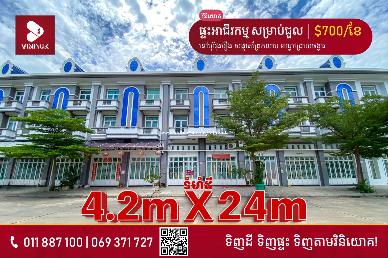 🏡ផ្ទះអាជីវកម្ម សម្រាប់ជួល!! 📍ទីតាំង៖នៅបុរីរុងរឿង ខណ្ឌជ្រោយចង្វារ - តម្លៃជួល : $700ខែ - ទំហំដី : 4.2m x 24m - ទំហំផ្ទះ : 4.2m x 16m - បន្ទប់គេង 5, បន្ទប់ទឹក 6 - សម្ភារៈ មិនមាន - កក់2 បង់1 កុងត្រា1ឆ្នាំឡើង - លេខអាជ្ញាប័ណ្ណ : E-22-404
