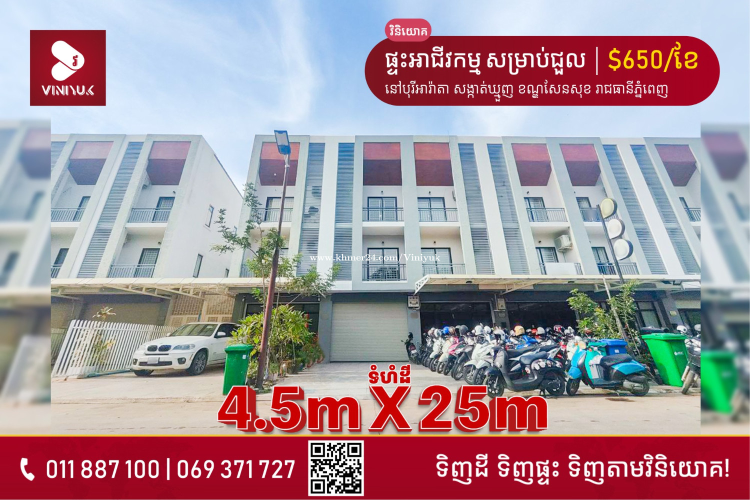 🏡ផ្ទះអាជីវកម្ម សម្រាប់ជួល!! 📍ទីតាំង៖ នៅបុរីអារ៉ាតា សង្កាត់ឃ្មួញ ខណ្ឌសែនសុខ រាជធានីភ្នំពេញ - តម្លៃជួល: $650/ខែ ចរចា - ទំហំដី: 4.5m x 25m - ទំហំផ្ទះ: 4.5m x 16m - បន្ទប់គេង4, បន្ទប់ទឹក5 - ផ្ទះមានសម្ភារៈ ទូរសម្លៀកបំពាក់4,បំពង់បឺត1,សង្ក្រាន្តអេឡិចត្រូនិក1 - ទិស ត្បូង - លេខអាជ្ញាប័ណ្ណ : E-22-404