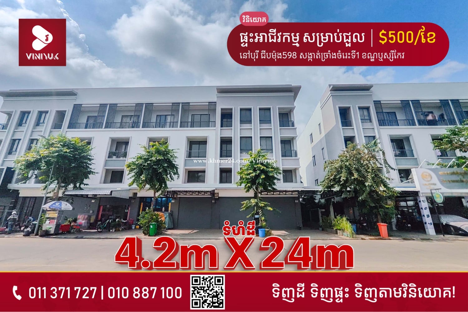 🏡ផ្ទះអាជីវកម្ម សម្រាប់ជួល!! 📍ទីតាំង៖ នៅបុរីជីបម៉ុង598 សង្កាត់ច្រាំងចំរេះទី1 ខណ្ឌឬស្សីកែវ រាជធានីភ្នំពេញ - តម្លៃជួល: $500/ខែ ចរចា - ទំហំដី: 4.2m x 24m - ទំហំផ្ទះ: 4.2m x 16m - បន្ទប់គេង4, បន្ទប់ទឹក5 - ទិស កើត - សម្ភារៈ តុបាយ1ឈុត - លេខអាជ្ញាប័ណ្ណ : E-22-404 📲សូមធ្វើការទំនាក់ទំនង ៖ 011887xxxClick To Call | 069371xxxClick To Call
