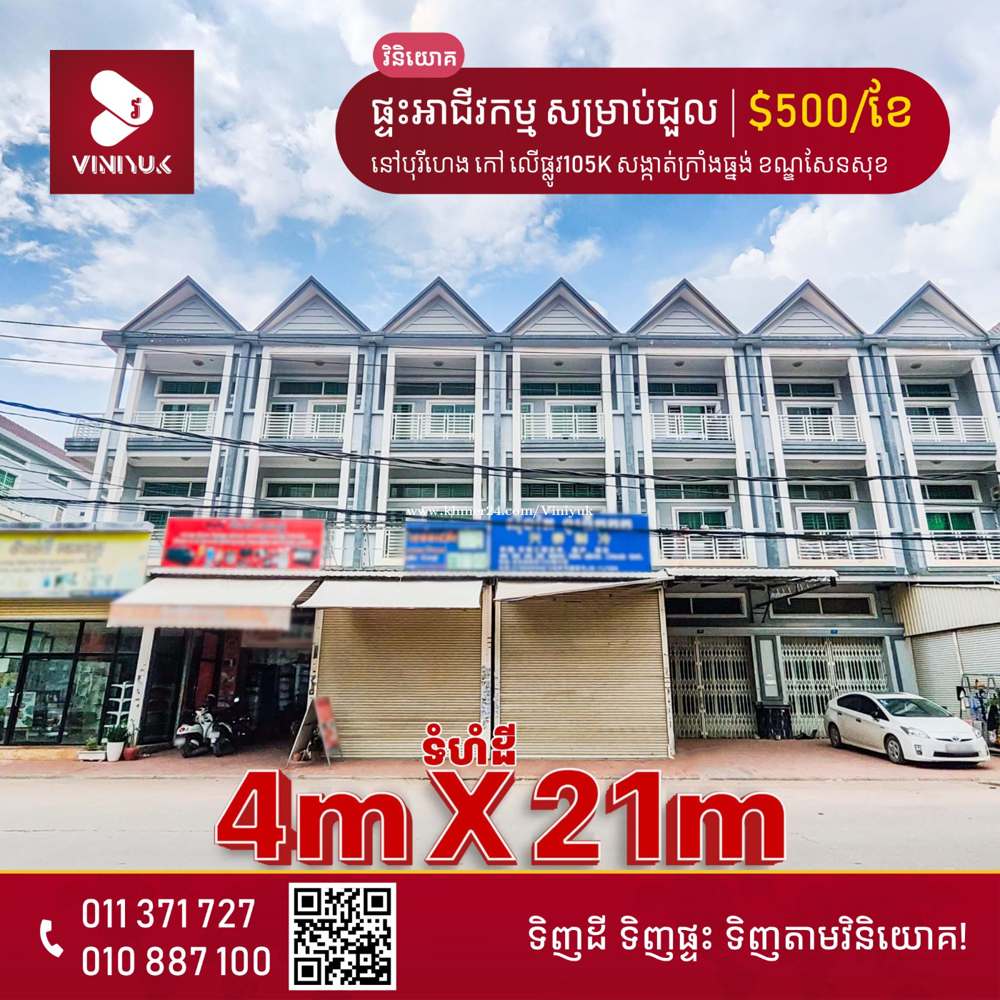 🏡ផ្ទះអាជីវកម្ម សម្រាប់ជួល!! 📍ទីតាំង៖ នៅបុរីហេងកៅ លើផ្លូវ105K សង្កាត់ក្រាំងធ្នង់ ខណ្ឌសែនសុខ រាជធានីភ្នំពេញ - តម្លៃជួល: $500/ខែ ចរចា - ទំហំដី: 4m x 21m - ទំហំផ្ទះ: 4m x 16m - បន្ទប់គេង4, បន្ទប់ទឹក5 - ទិស កើត - សម្ភារៈ មិនមាន - លក្ខខណ្ឌ: កក់1បង់1កុងត្រា1ឆ្នាំ - លេខអាជ្ញាប័ណ្ណ : E-22-404 📲សូមធ្វើការទំនាក់ទំនង ៖ 011887xxxClick To Call | 069371xxxClick To Call